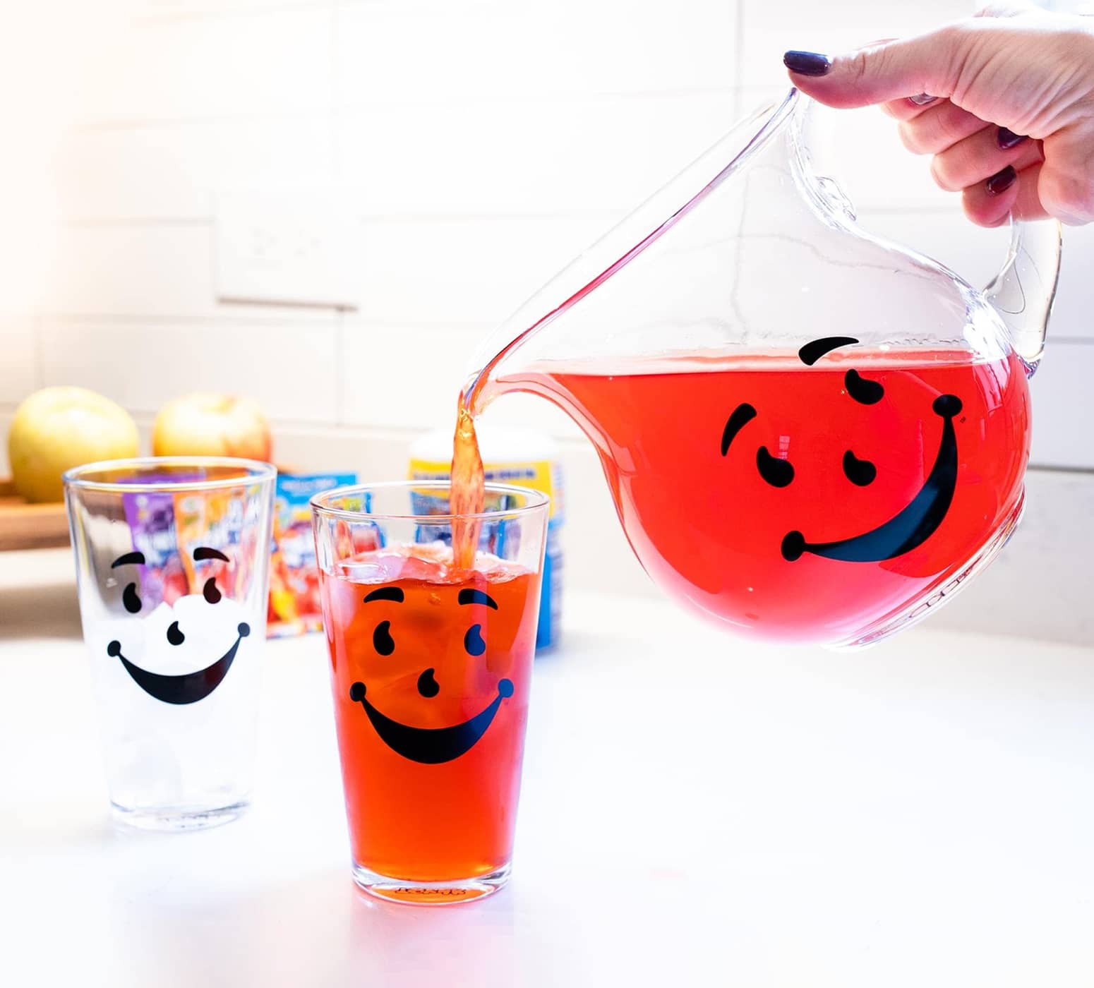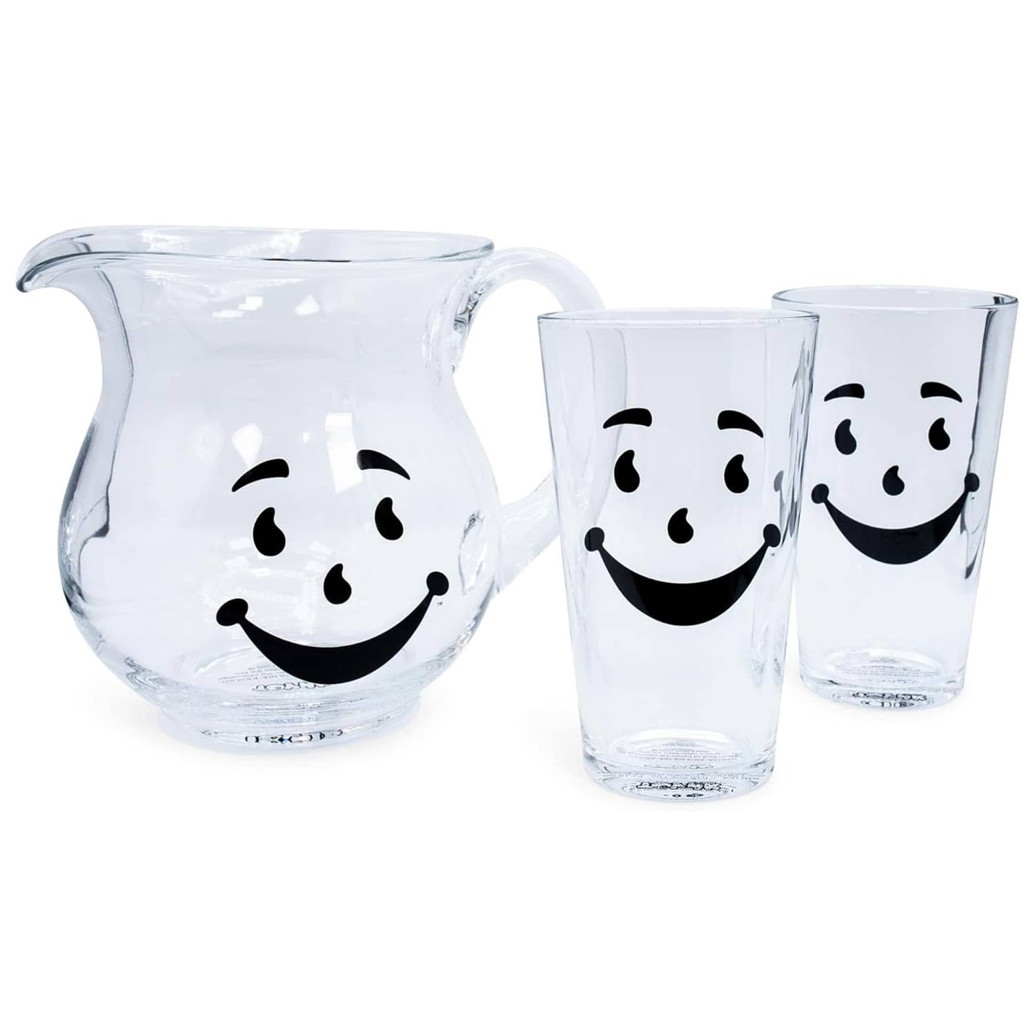 OH YEAH! If you love Kool-Aid, there's simply no better way to serve it up than in this cool new yet quite retro-inspired Kool-Aid Man Glass Pitcher and Pint Glass Set. This glass serving pitcher is just like the animated talking face pitcher from the old Kool-Aid television commercials and the Kool-Aid Man himself, except this one doesn't talk or crash through a wall causing incredible property damage. The pitcher holds 64 ounces of Kool-Aid and 2 matching smiling face pint glasses are included.