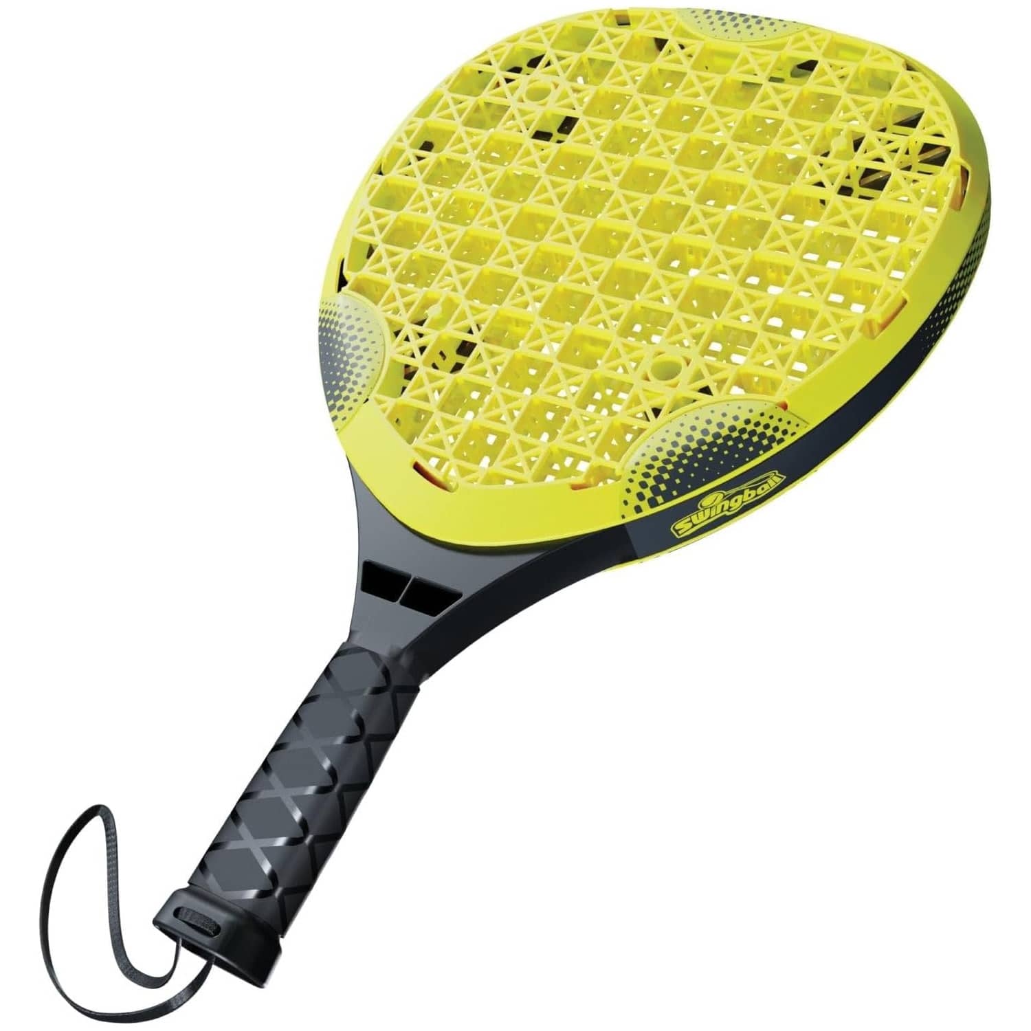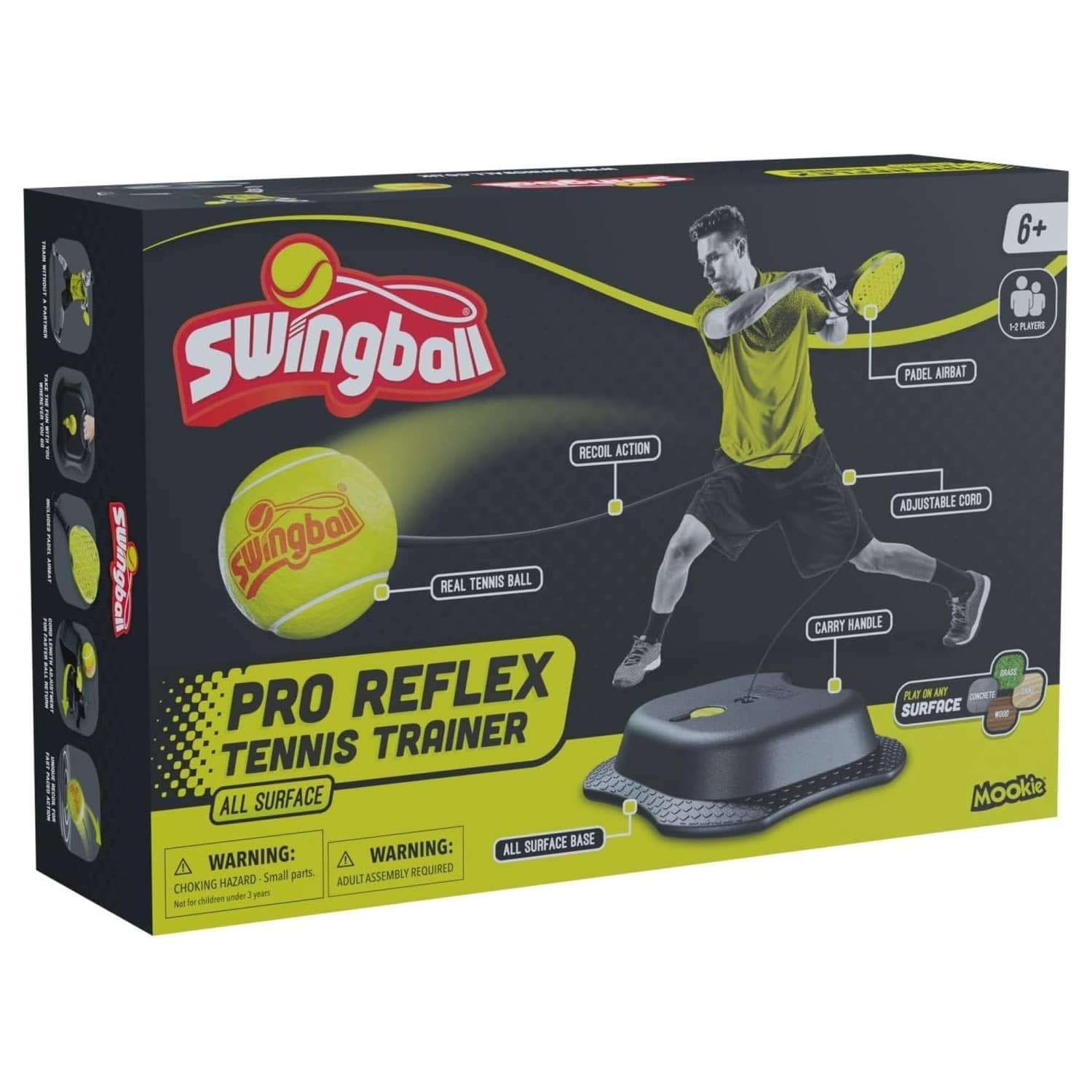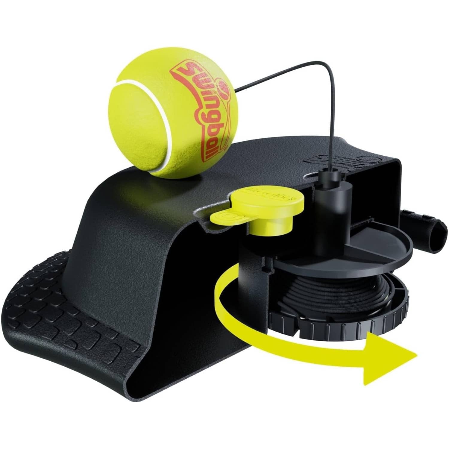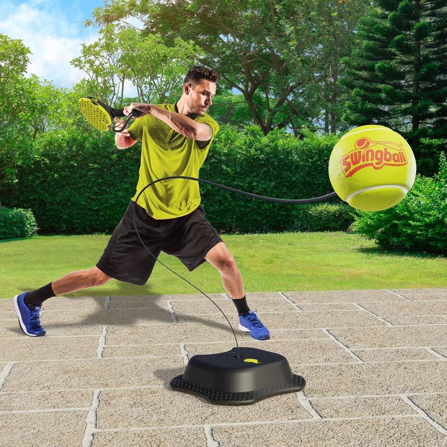 This cool new Swingball Pro Reflex Tennis Trainer lets you practice your tennis-playing skills, get in a workout, or just have fun while relieving stress and boredom without needing a tennis court, a net, or even an opponent. This all-surface (concrete, sand, wood, grass) tennis trainer has a real tennis ball attached to an adjustable reflex cord that can be hit with the Power Paddle, which replicates the feel of a real tennis racquet, and it returns with a bounce to be hit over and over again. It's like playing tennis with an invisible person. It features a weighted non-slip base, a fully adjustable and tangle-free recoil cord, and includes the lightweight racquet with a grip tape handle and wrist cord. It's perfect for practicing strokes, building stamina and speed, improving hand-eye coordination, and driving your confused, tennis ball-chasing dog crazy. πΎ