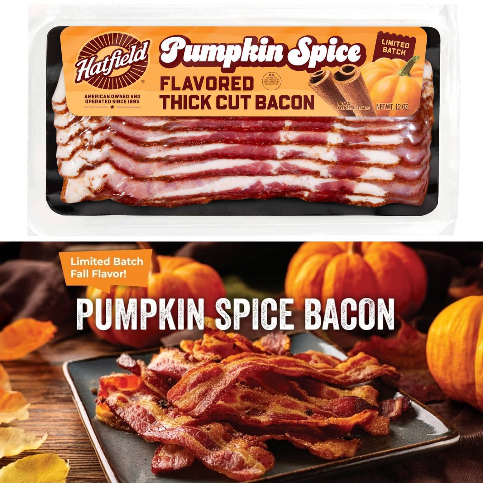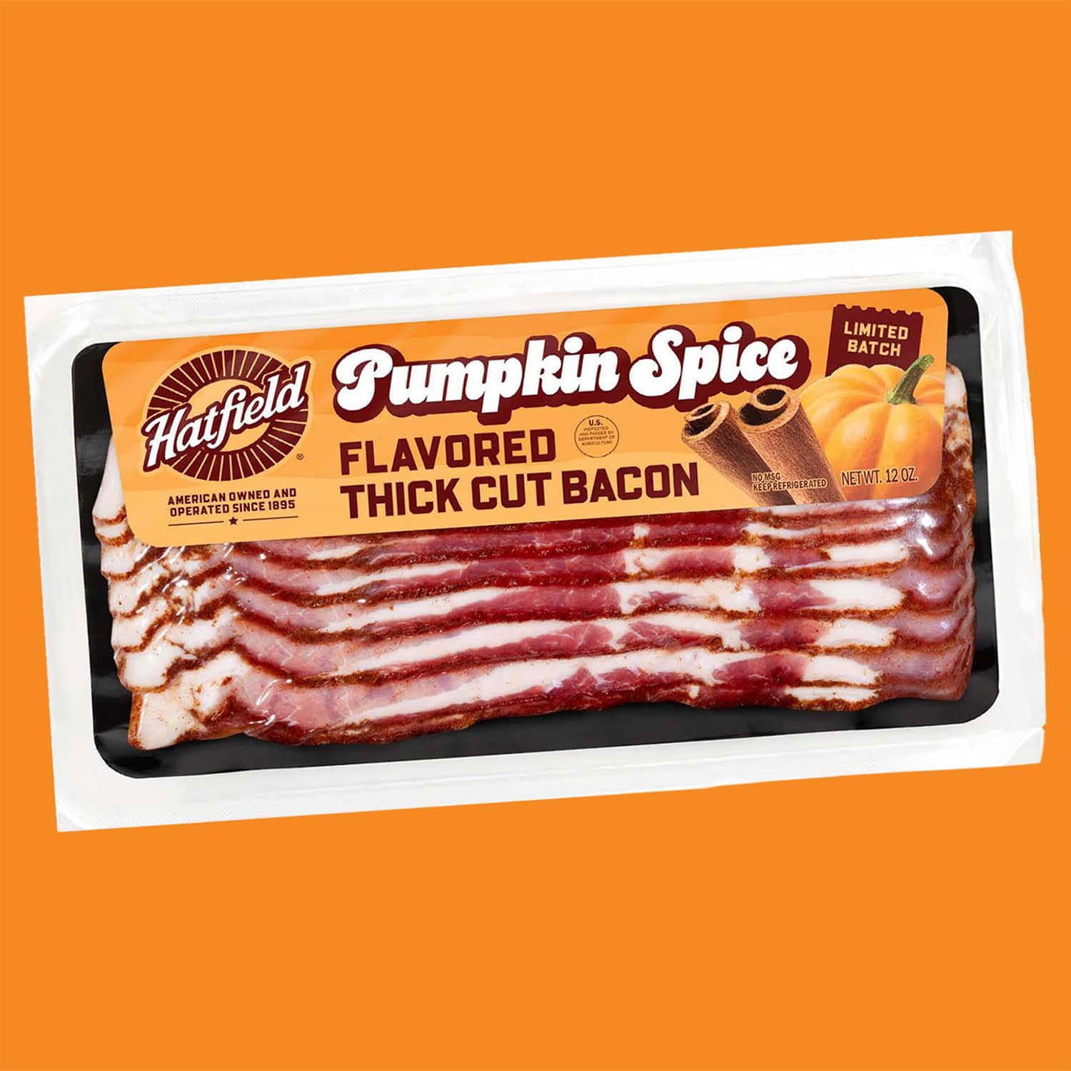 Well, it finally happened. Just when you thought society had reached peak pumpkin spice, along comes this cool new Hatfield Pumpkin Spice Thick Cut Bacon. Yep, this sweet, savory, and smoky thick cut bacon has a seasonal pumpkin spice dry rub flavor coating of cinnamon, ginger, nutmeg, allspice, sugar, and vanilla bean. It's perfect for sizzling up on a chilly Autumn morning along with pumpkin spice-seasoned eggs, pumpkin spice-buttered toast, and a pumpkin spice latte to wash it down. Available for a limited time only. Hmm, maybe we'll get peppermint-flavored bacon for Christmas now? π₯ππ