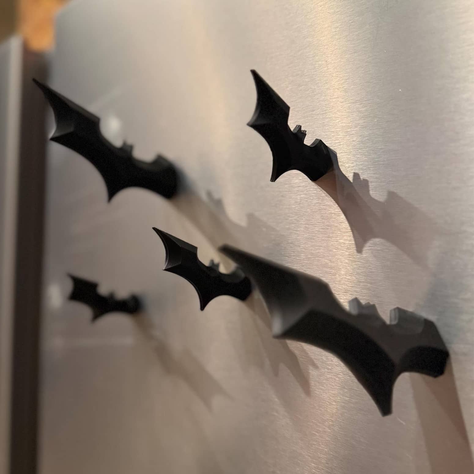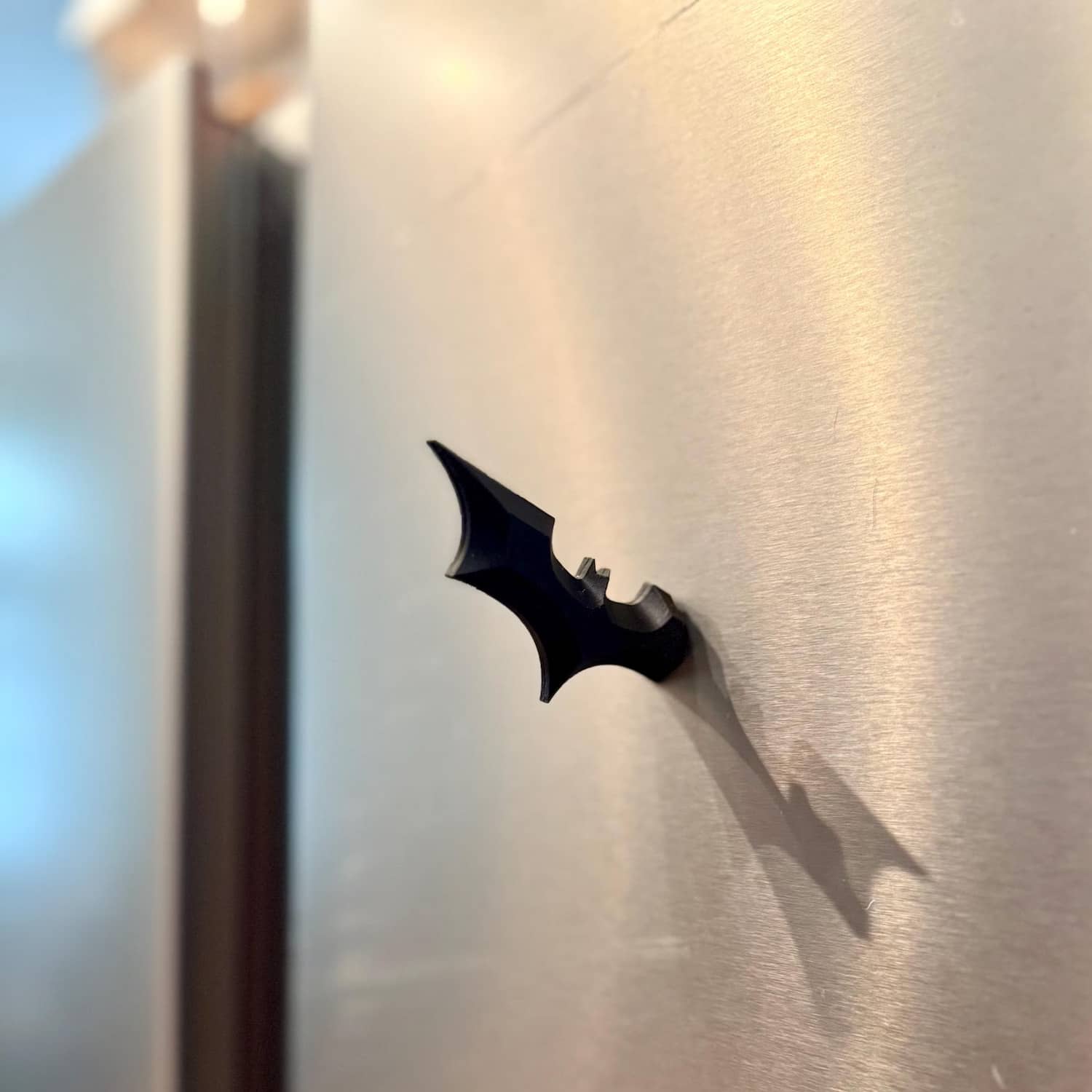 Everyone who passes by your refrigerator will be doing double-takes when they see papers, notes, memos, drawings, finger paintings, or just a single Joker playing card hung on it, seemingly by the Dark Knight himself, with these cool new Bat Magnets. Inspired by Batman's iconic Batarangs, these lethal-looking refrigerator magnets may look like they were stuck into the side of the fridge with a heroic throw, but it's just an illusion. These matte black bat-shaped throwing weapons/fridge magnets are 3D-printed and have a blunt side with a strong magnet. They're perfect for hanging things on magnetic surfaces in your kitchen, office, workshop, or bat cave and make a cool gift for Batman lovers, geeks, nerds, and dorks, or just enthusiasts of regular bats, the only winged flying mammals. Check out the videos below to see the Batarang in action. π¦π¦ΈββοΈπ§²