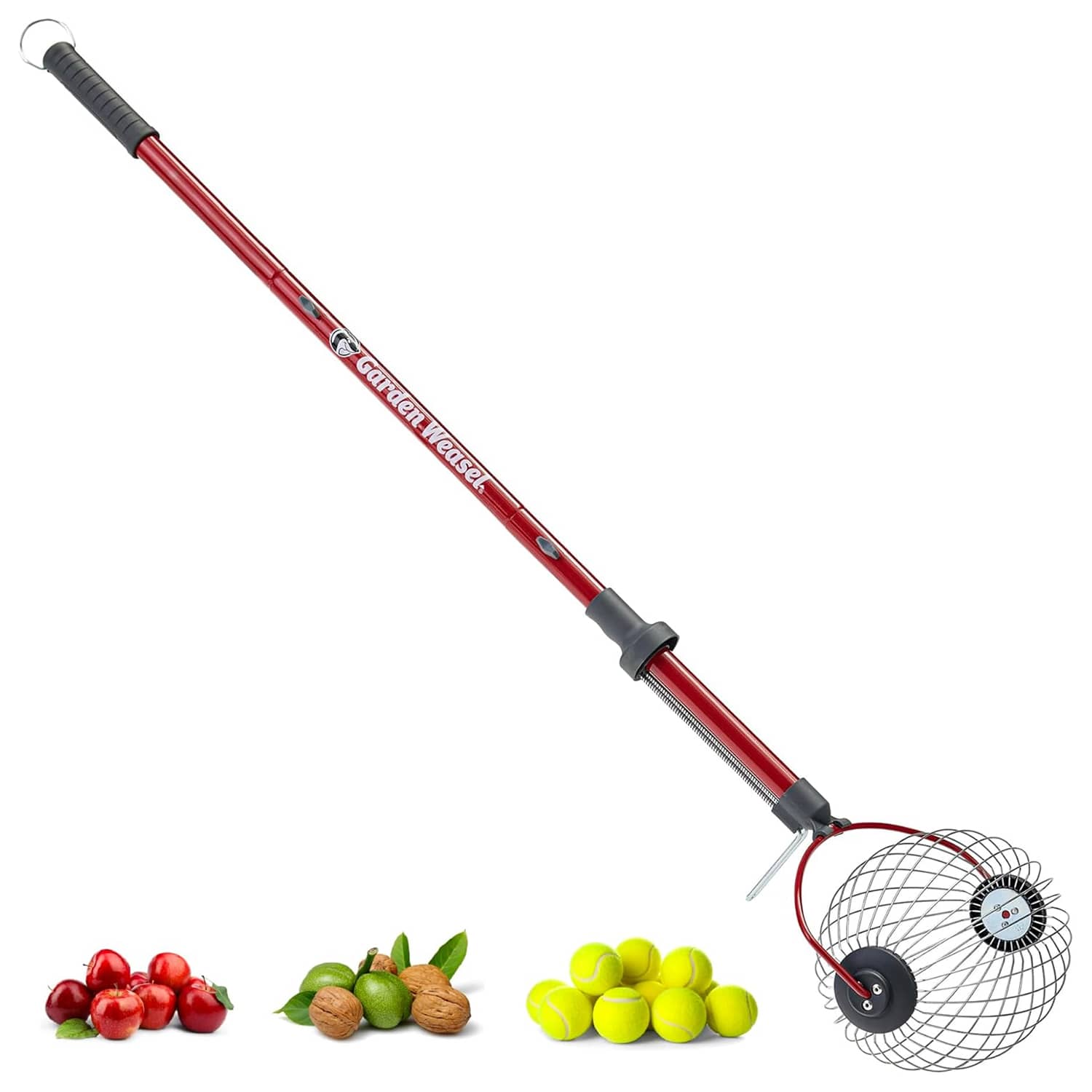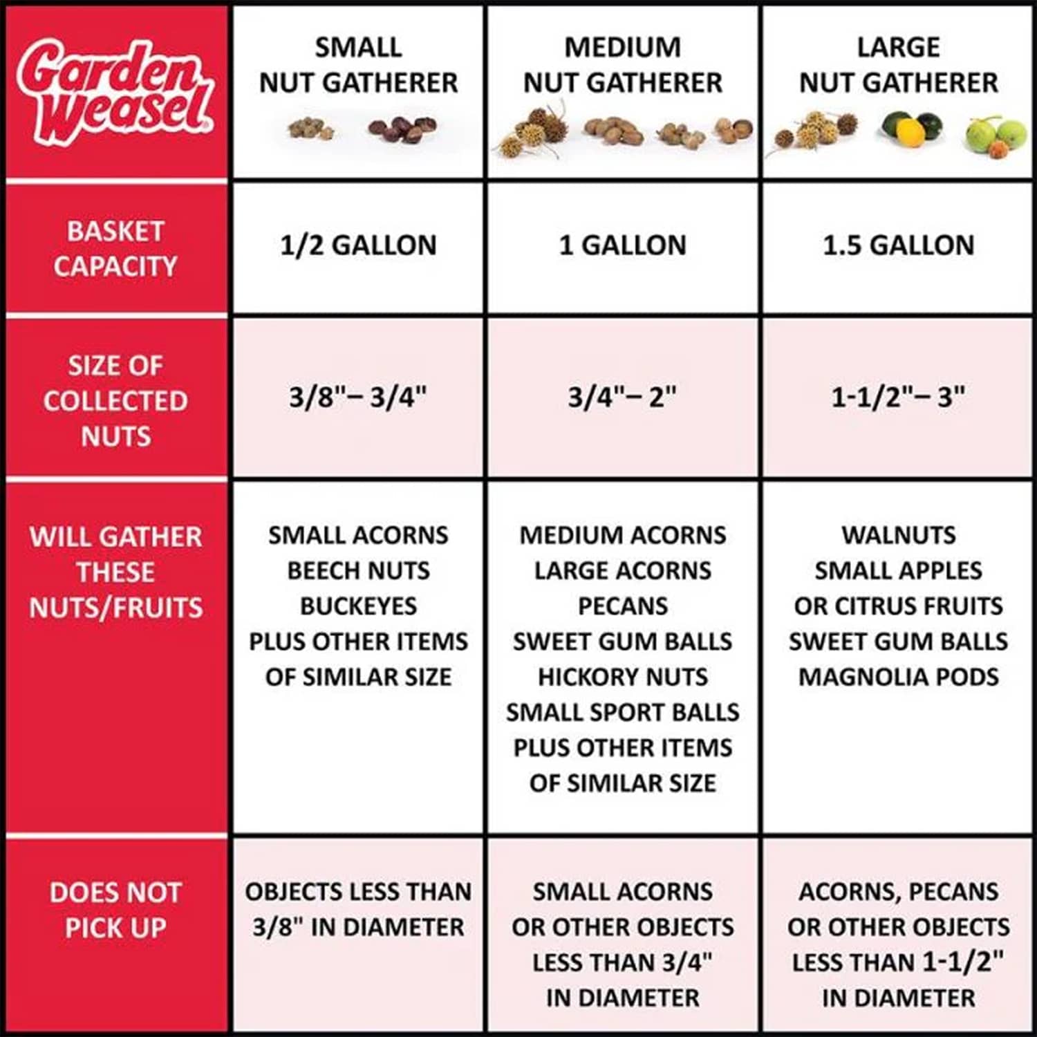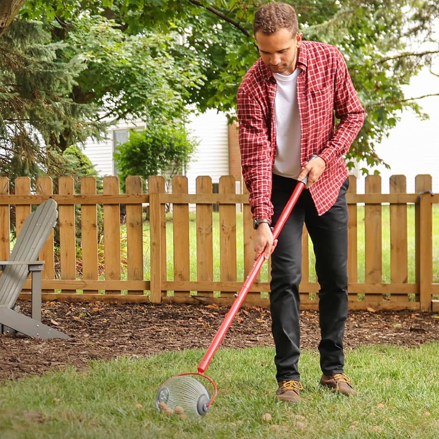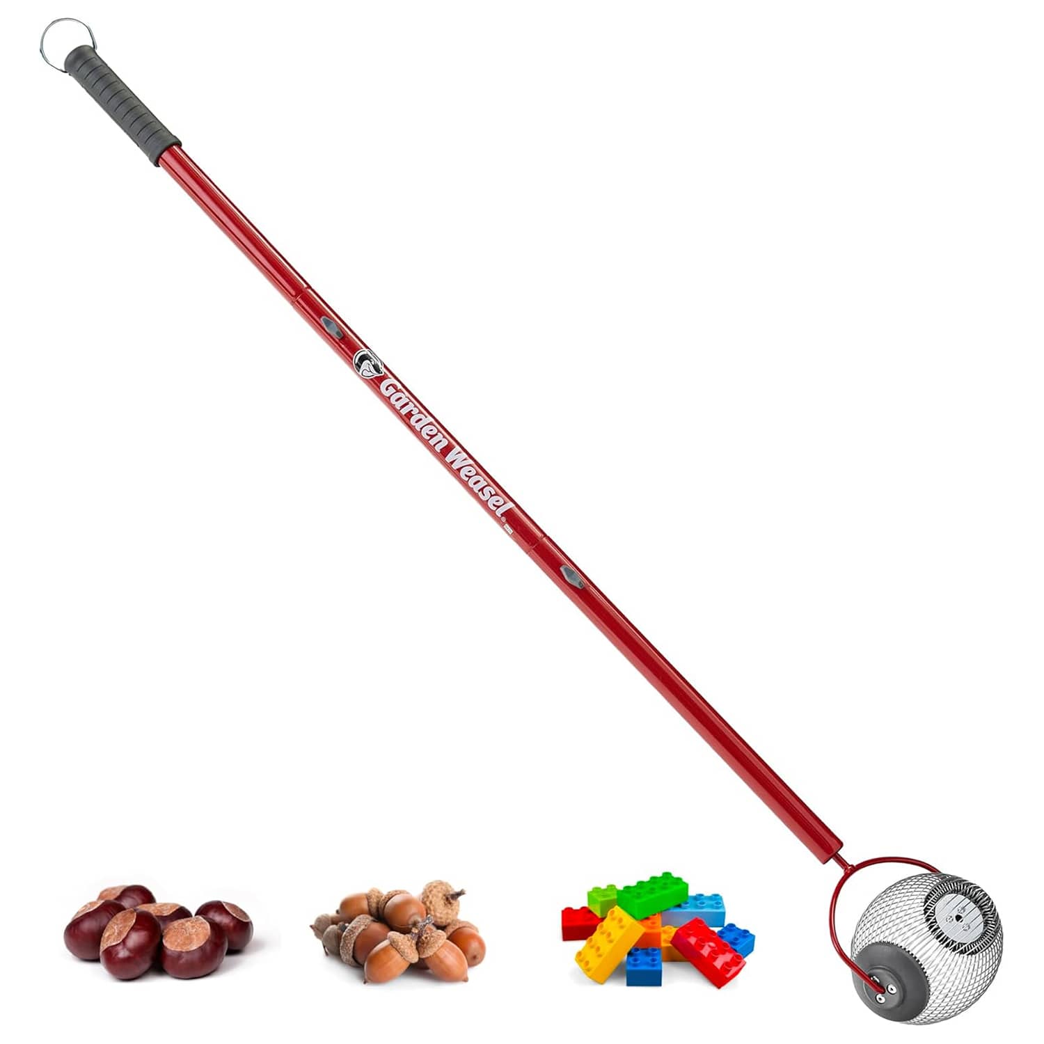 This fall, if you don't have enough squirrels around to help you gather up all the nuts that have fallen from the trees, then check out this cool new Garden Weasel Nut Gatherer. Rather than bending over to pick up all the various nuts, pine cones, fruits, seed heads, and other small debris all over your yard, just roll this handy tool over it all and the flexible tempered steel wire gathering cage quickly picks them up for you. To empty, just spread the tines apart. It's available in 3 sizes that pick up everything from little acorns and LEGO bricks to walnuts and golf balls to apples and tennis balls. Check out the videos below to see it in action.