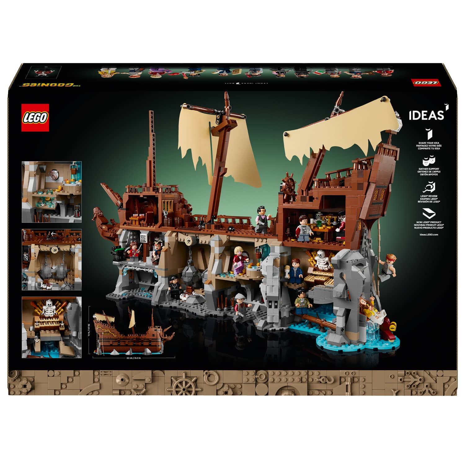 While not quite as large as One-Eyed Willy's π€ full-scale Inferno pirate ship built for the movie, this scaled-down LEGO model of it is still huge at 2,912 pieces. Once assembled, you can turn it to one side to show off the pirate ship's detailed exterior with Sloth and Chunk sliding down the mast on the deck or flip it around to reveal different iconic scenes from the movie. It has Willy's treasure room, the Fratellis' hideaway with a secret fireplace entrance to the caves below, Sloth's dungeon, the falling boulders cave trap, use the Copper Bones Skeleton Key to activate the trap door, the spike cave, the wishing well, the skeleton organ with falling floor (don't accidentally play the wrong notes), and a waterslide out the back to a waiting gigantic octopus, who was unfortunately cut out of the final movie, but you can watch the deleted scene here. Hmm, where's the part where Mama Fratelli threatens to put Chunk's hand in the blender? Oh, never mind, it's hilariously in there too! It also includes 12 LEGO minifigures of all the key characters from the movie, including Data with all his inventions and gadgets, but the Statue of David with an upside-down, uh, member is surprisingly missing.