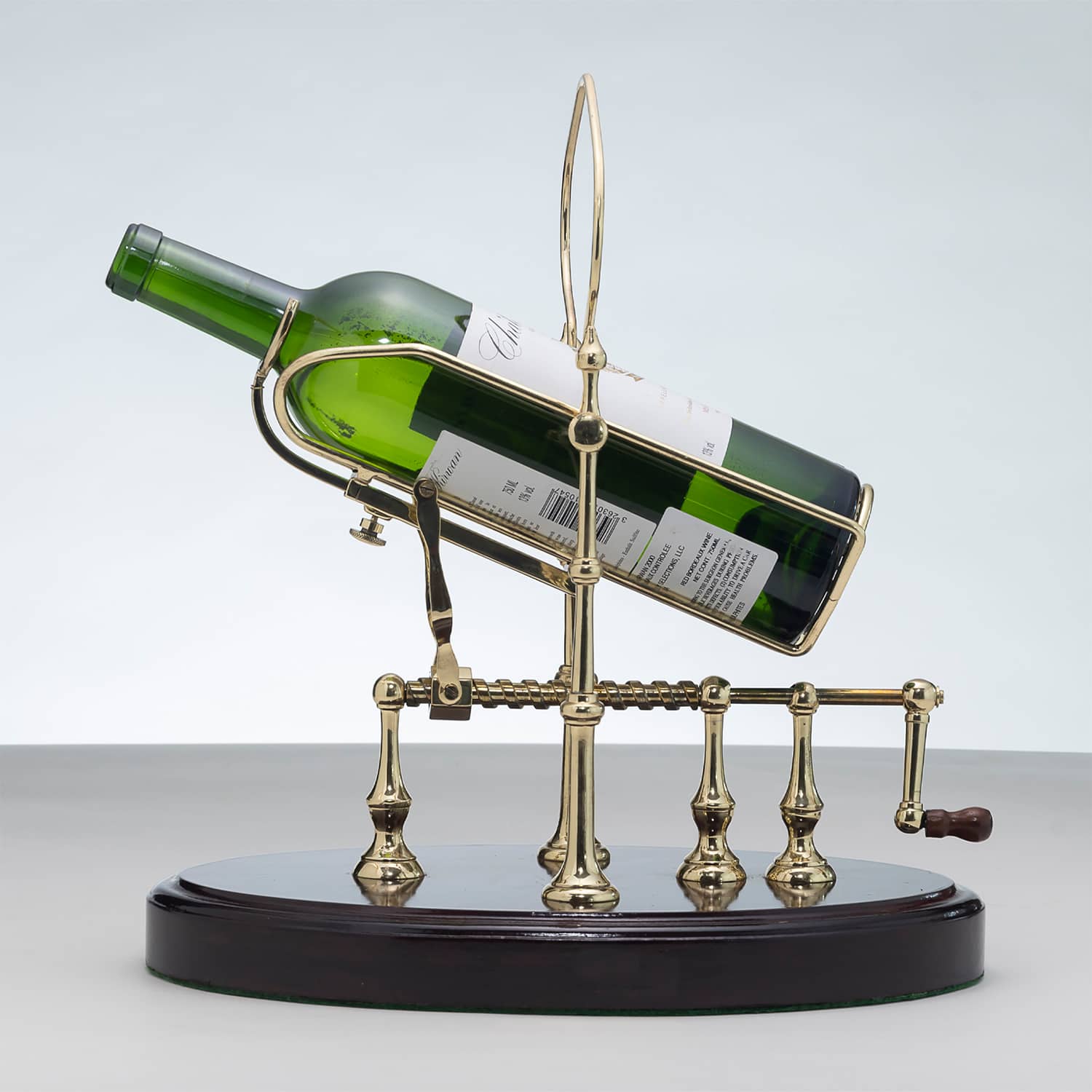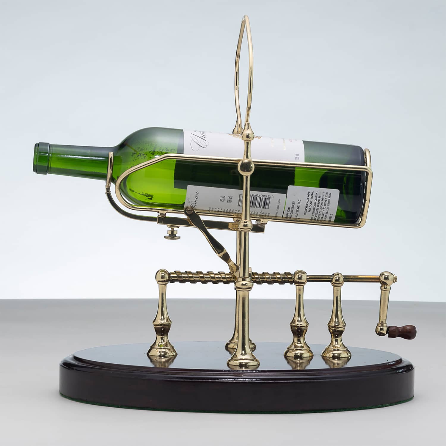 To use, just place a bottle of wine on the stand, start turning the little crank handle, and then enjoy the building anticipation as it slowly tips the neck of the bottle down towards a wine glass in need of filling. The slow pour also helps to keep sediment out of the glass. When your glass is sufficiently full, simply reverse the process to return it back its original non-pouring position. It's crafted from bronze, has a wooden base, and holds a standard 750mL bottle of wine. It's perfect for eccentric wine lovers, lazy wine lovers, French antique-loving wine lovers, delayed gratification-loving wine lovers, or just wine lovers in need of a cool conversation starter or interesting curio for their home bar. It also makes a unique gift. Patience not included. π«π·π·π’π¦₯
