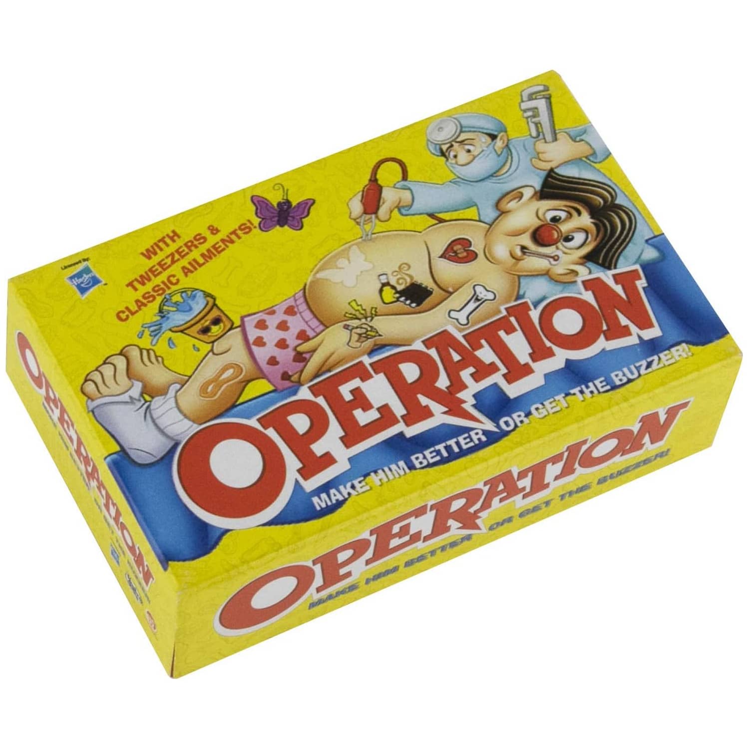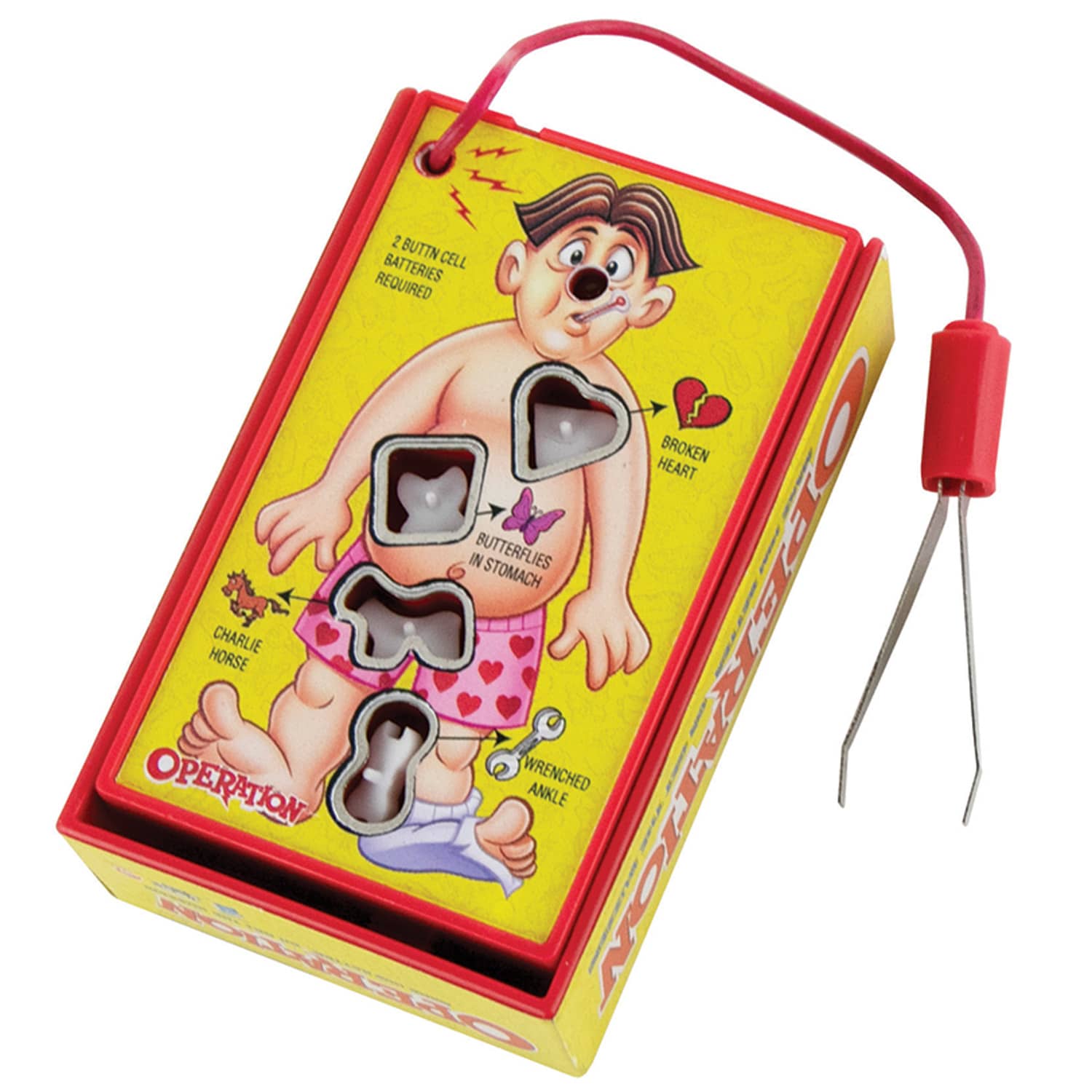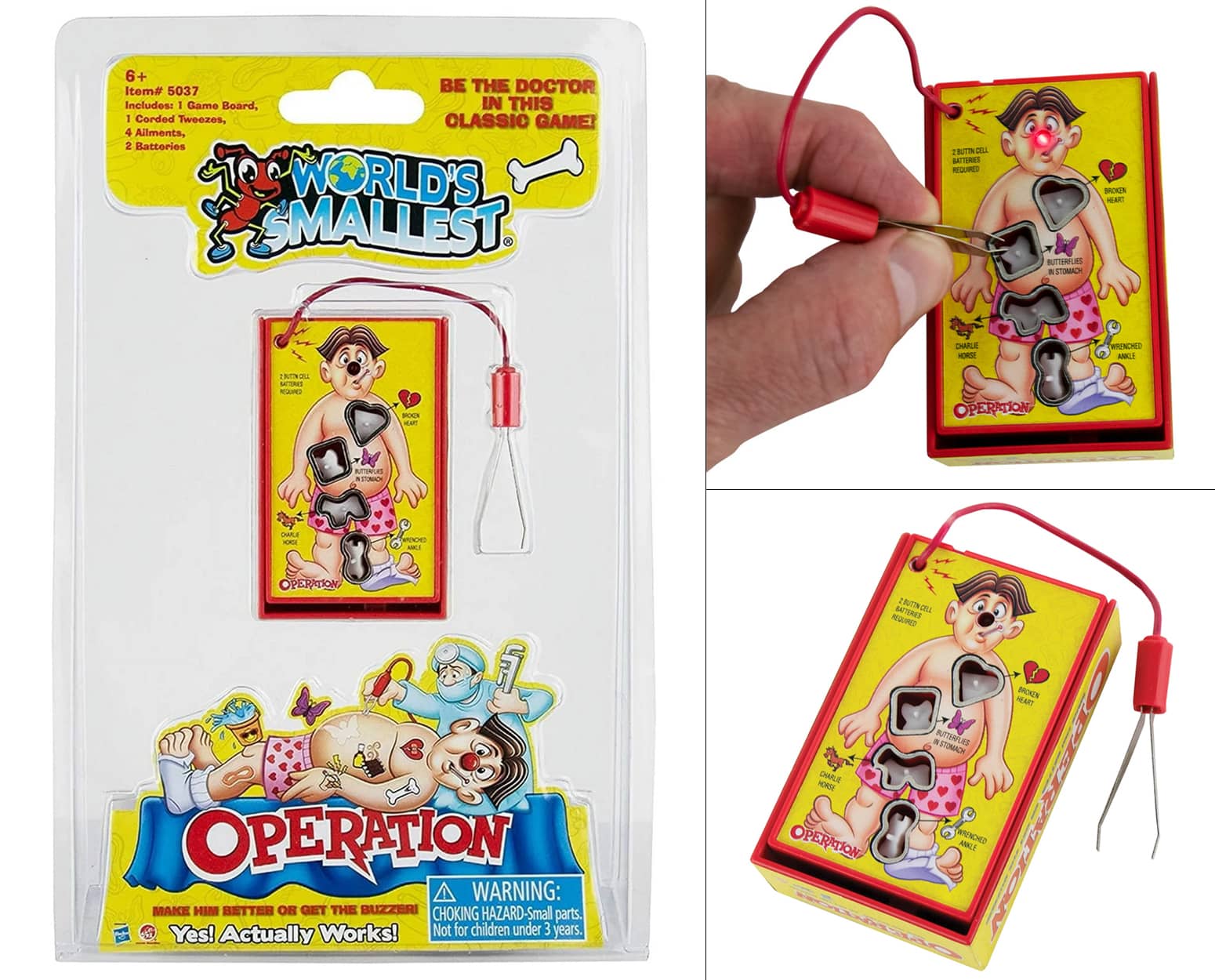 If you thought operating on poor Cavity Sam was difficult on the full-sized version of the Operation Board Game, then you better have an even steadier hand and stronger nerves of steel to battle the tension while operating on this cool new World's Smallest Operation Board Game. This ultra-tiny version of the classic Operation electronic board game challenges you to remove poor Cavity Sam's ailments, a broken heart, a Charlie horse, a wrenched ankle, and a butterfly in his stomach, with equally tiny tweezers without setting off the loud buzzer and making Sam's nose glow red by accidentally touching the sides. Since they are so small, the removable body parts in this version are thankfully now attached to strings to help prevent losing them and the game includes a built-in box for storage, just flip the game over into it. It makes a great gift for kids of all ages, especially nostalgic surgeons.