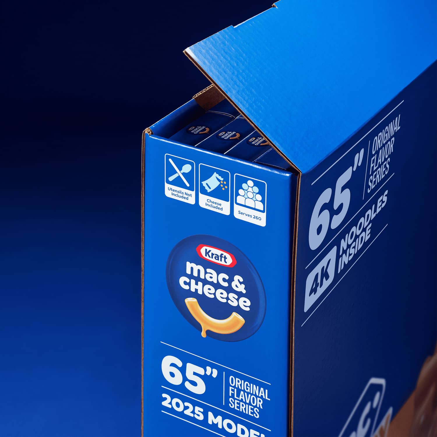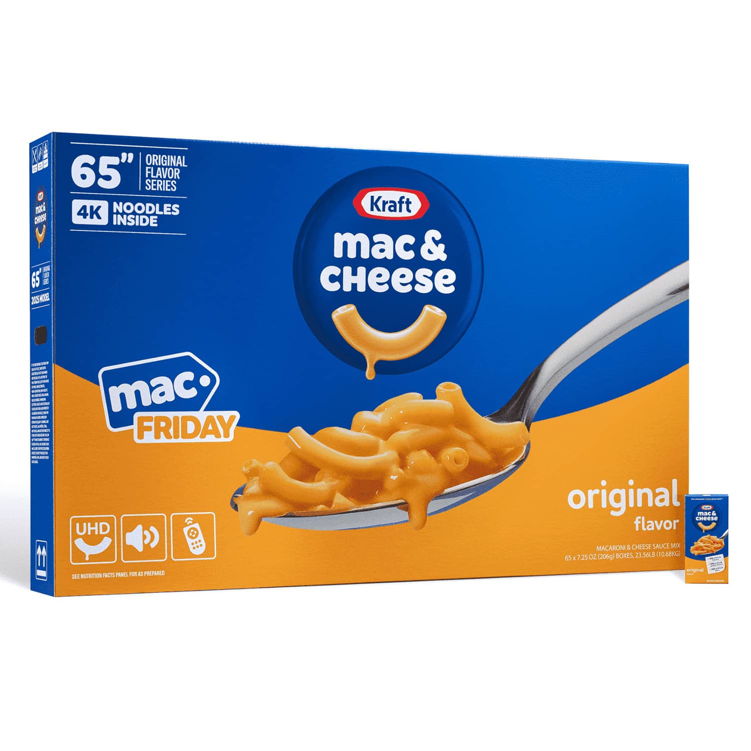 For many, many years now, a Black Friday tradition has been to brutally fight off endless hordes of deal-crazed lunatic shoppers all trying to get their hands on a cheap flatscreen TV. If you actually succeeded in somehow wrestling it away from the vicious mob, getting it to the checkout and out through the door to your getaway car was a whole other nightmare. Well, this Black Friday, November 28th, 2025 at midnight EST, Kraft Mac & Cheese will be selling a 65-inch flatscreen TV-shaped box filled with 65 boxes of Original Kraft Mac & Cheese Dinners at Walmart for only $19.37. This super low price is in honor of the year they were originally founded. Best of all, you can try and order this online from the comfort (and safety) of your home by simply going to this link at midnight: 65-Inch Mac Friday Box. Unfortunately, this will most likely sell out instantly as you compete with a now near-infinite legion of at-home Black Friday shoppers and bots all trying to get one too... to sell as a collectible on eBay. Good luck serious Kraft Mac & Cheese lovers! π§πΊπ