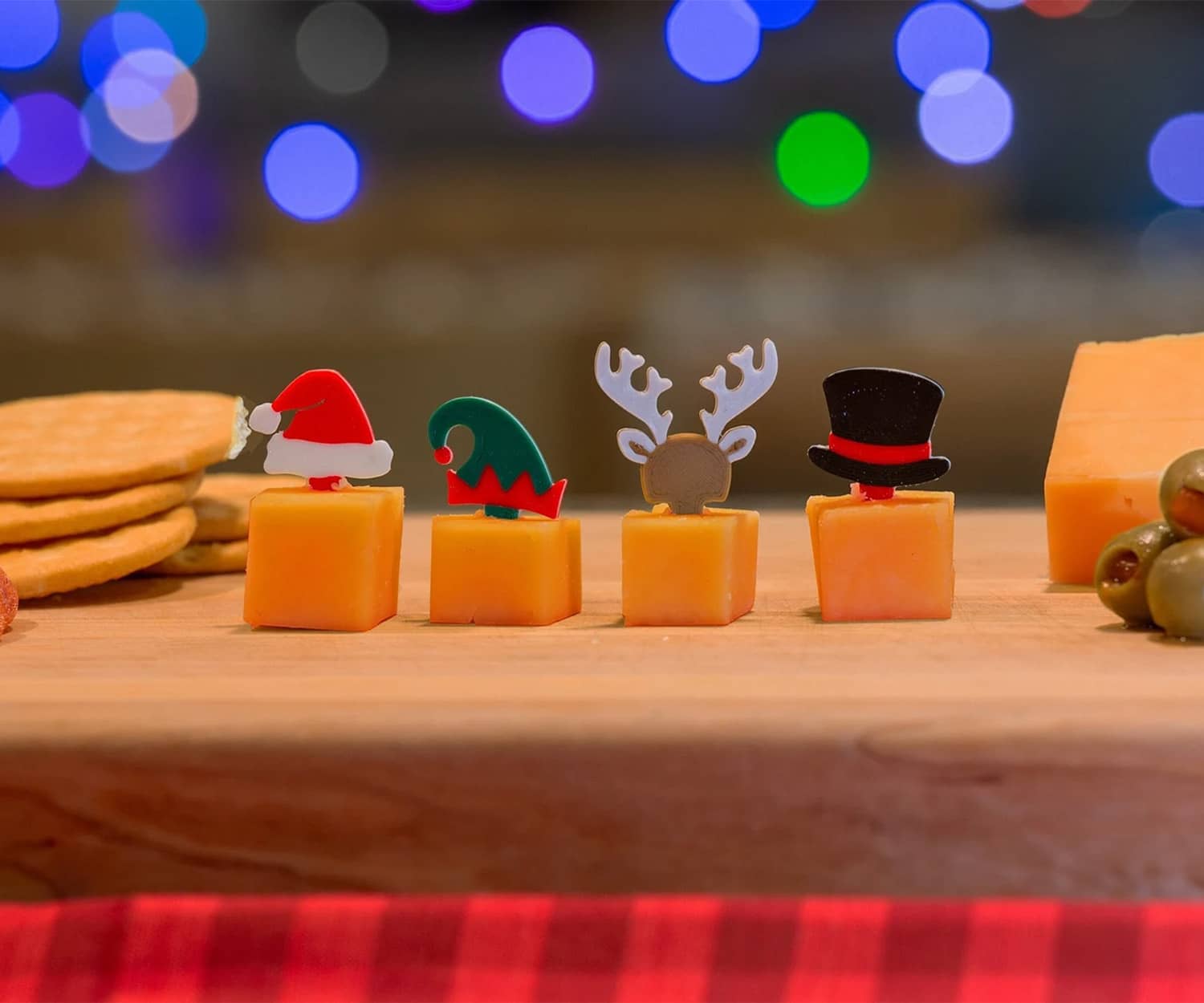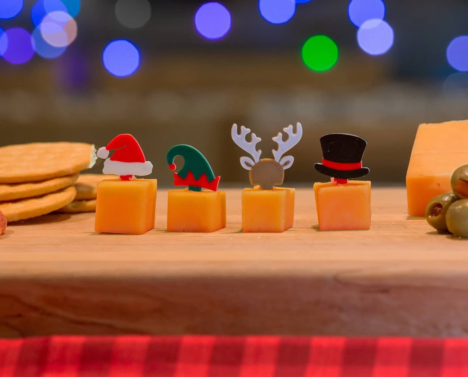 'Tis the season for holiday parties and charcuterie boards, cheese boards, and other tasty little appetizers, so serve them up to your festive guests along with these cool new Christmas Party Food Pick Holiday Hats. These whimsical Christmas-themed party picks are shaped like little holiday hats: Santa Claus hats, elf hats, magical snowman top hats, and even reindeer antlers. They come in a pack of 20 with 5 of each style in every pack.