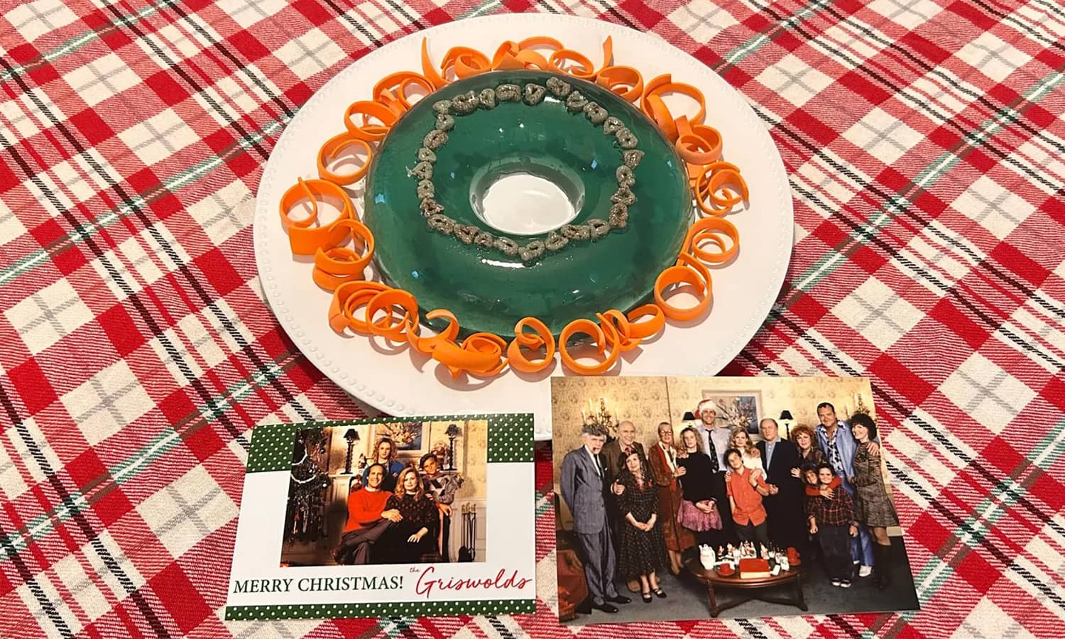 Hello, everybody! This holiday season, invite all your relatives to your home and try to have the hap-hap happiest old-fashioned family Christmas ever, just like the Griswolds did way back in 1989 in National Lampoon's Christmas Vacation. Well, no holiday feast would be complete without a seriously overcooked turkey, a dog under the table yakking on a bone, and Aunt Bethany's Jello Mold. Sure, you could make your own lime green jello mold with crunchy cat food for a topping and carrot ribbons as a fancy garnish, but since nobody will eat it, it's just easier to put this non-edible replica of it out instead. This realistic reproduction of Aunt Bethany's lime green jello mold comes on a white serving plate, looks and feels just like a real jello mold, and is decorated with fake cat food and fake carrot ribbons so you can display it year after year. Again, it's totally non-edible, but only your Cousin Eddie or equivalent relative would want to eat it anyways. It also comes with a Griswold family photo and a Griswold Christmas card as well. Play ball! ππΏοΈ