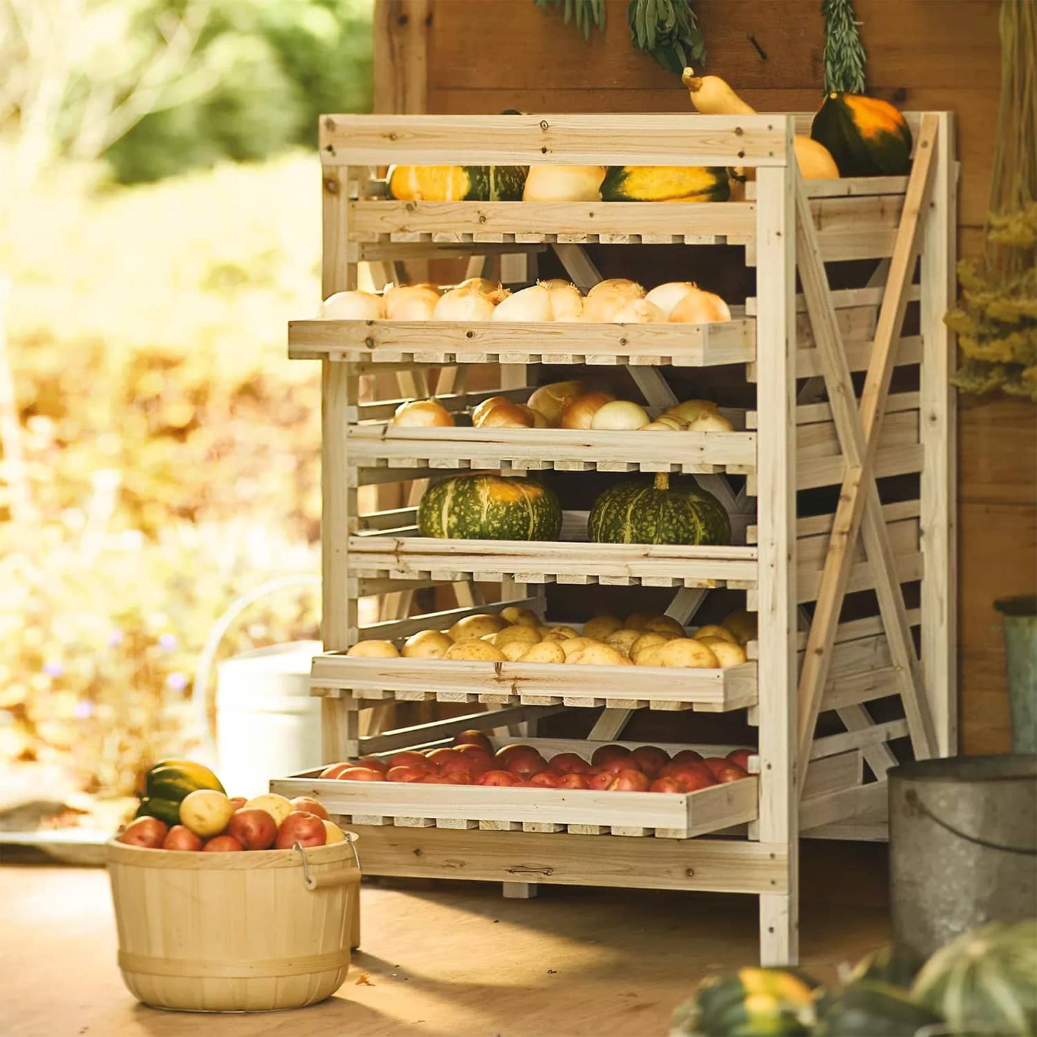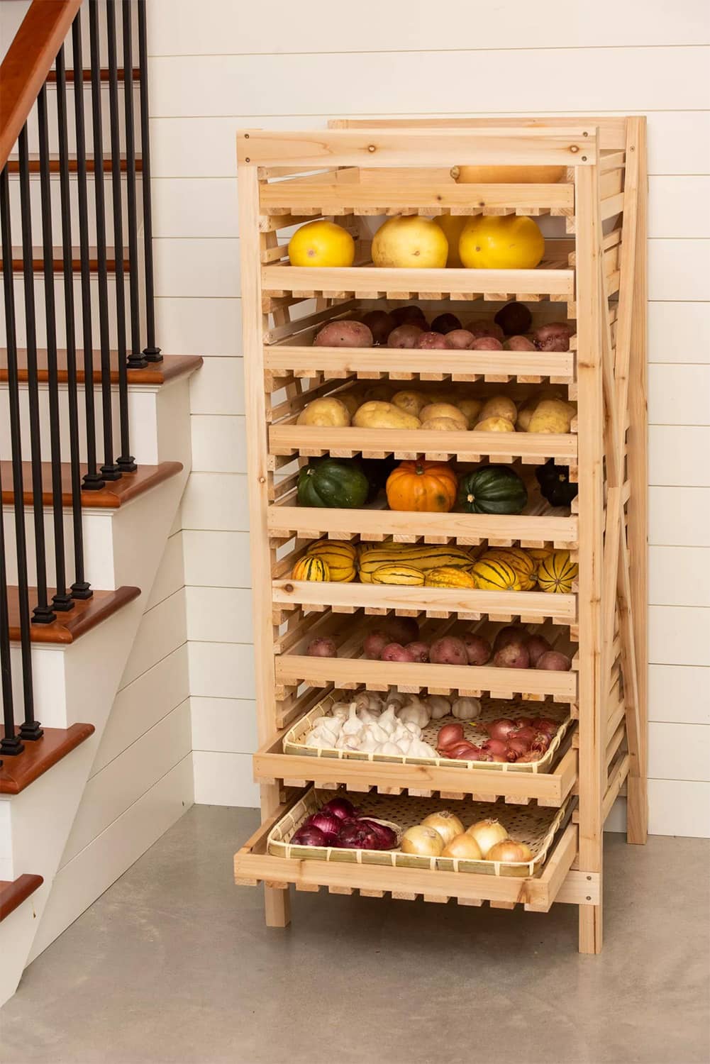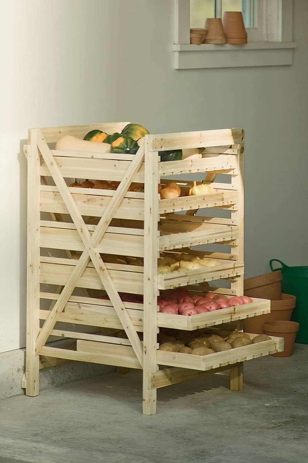 After you've brought in a bountiful harvest of keeper crops from your summer garden, help store them through the winter months with this cool new yet quite rustic Orchard Rack from Gardener's Supply Company. Just place this wooden storage rack in a cool and dry spot (a dark basement or root cellar would be ideal) and then fill up the drawers with root vegetables like potatoes, carrots, beets, radishes, onions, and garlic, squashes like winter or acorn, or even apples, cabbages, and more. It's crafted from untreated, rough-cut fir wood, has six sliding drawers that are slatted to ensure good air circulation, and it can even be used to dry fresh herbs as well. A larger 9 drawer version is also available. π₯π₯π§ π§π