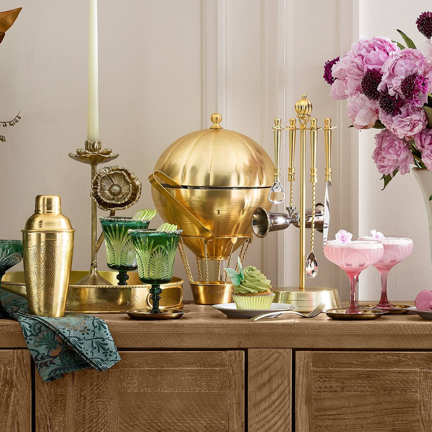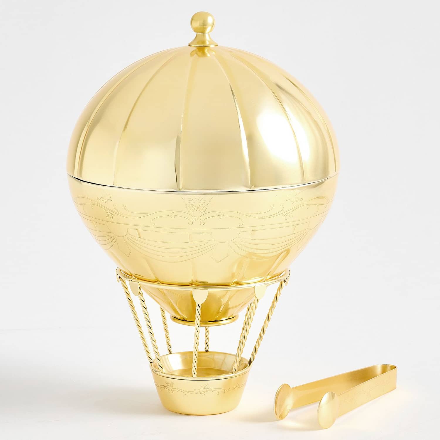 At your next elegant Emerald City-inspired gala soiree, unhinged blowout jubilee on the yellow brick road celebrating a house falling on the Wicked Witch of the East, or just a simple going-away party before clicking your heels together three times, serve up plenty of ice to your awesome OZian friends or simple guests back in the black-and-white world from this cool new yet quite retro Wicked Hot Air Balloon Ice Bucket from Pottery Barn. This large 2.5-quart ice bucket looks like a miniature version of the wonderful wizard of OZ's hot air balloon, except this one is made from gold-finished stainless steel and brass, includes serving tongs, and won't be able to fly you back to Kansas. Wizard not included.