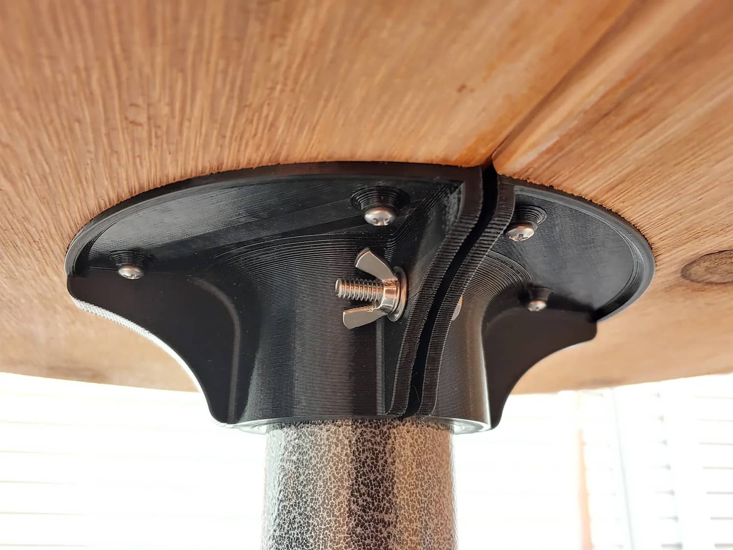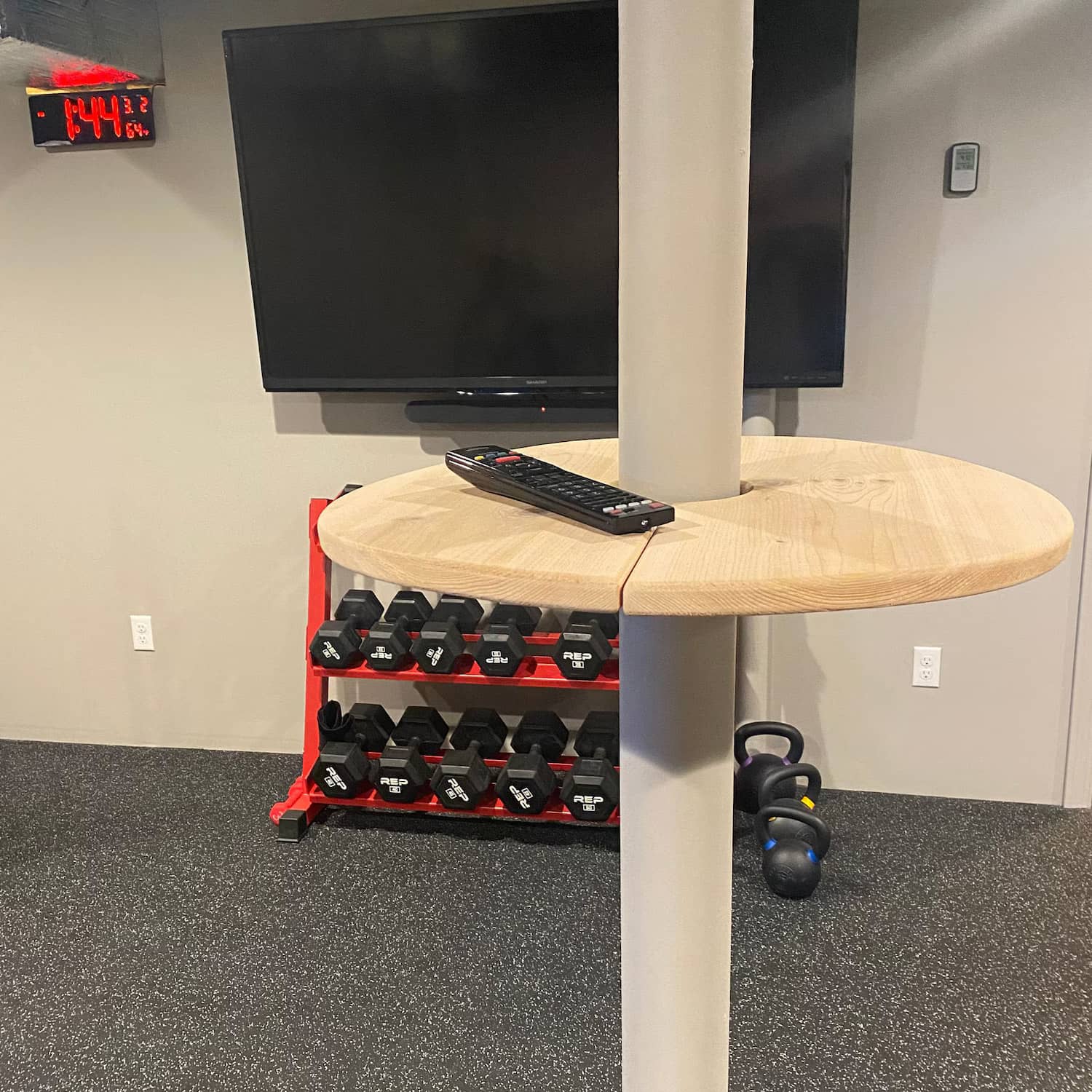 These clever circular cedar wood tabletops come in two halves, have a cut-out center in any diameter you need, and join together around a pole or post via an adjustable mount below. These unique pole tables are perfect for transforming a boring basement into a home pub where guests can stand around and chat with a perfect spot to set down their drinks and appetizers or you could just pull up a couple of bar stools around them as well. The tables can also be repositioned at any height on the pole or even removed with ease after a party.