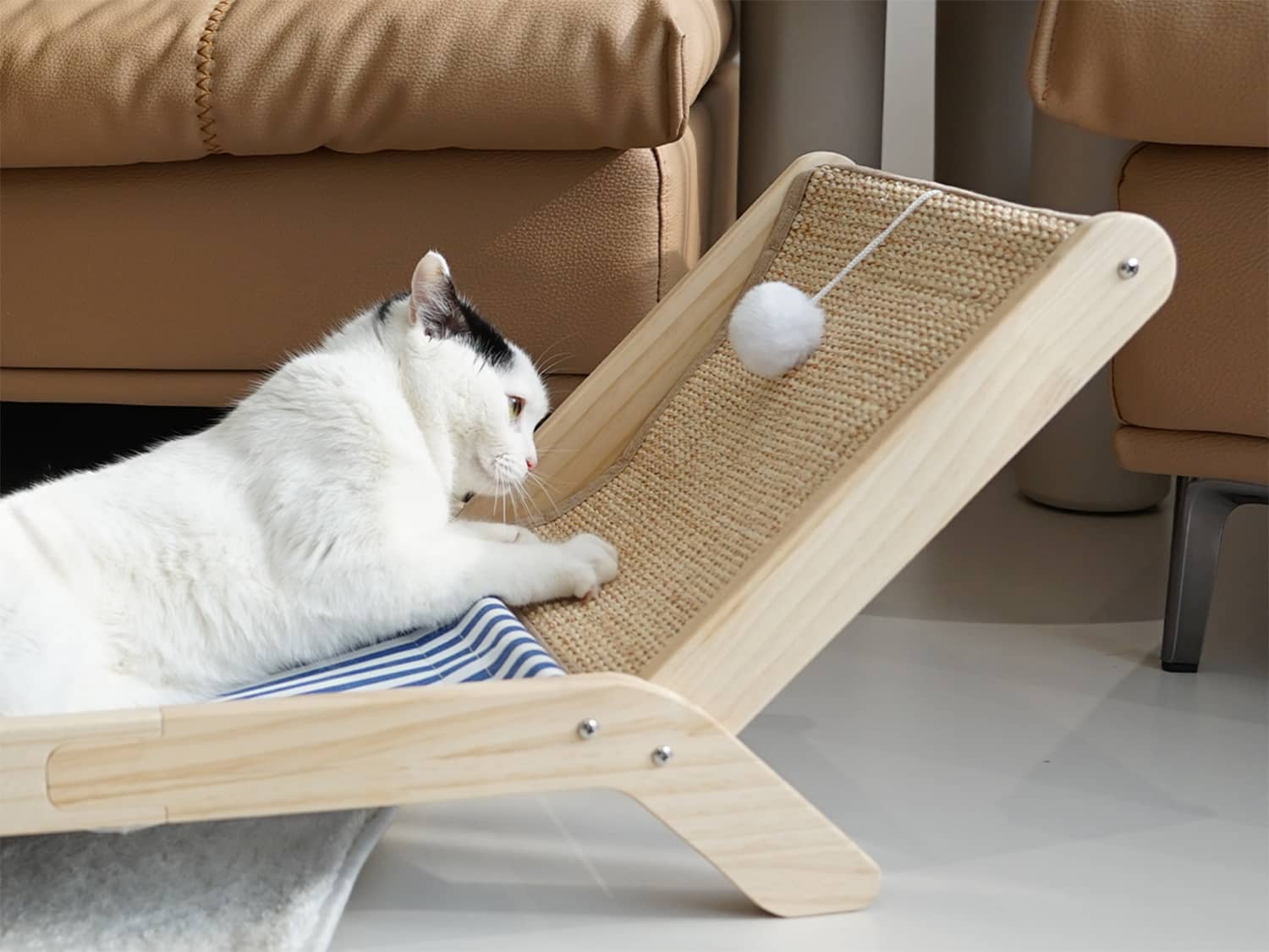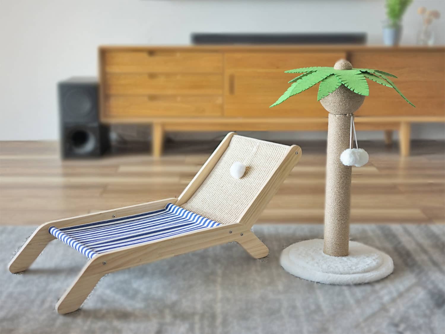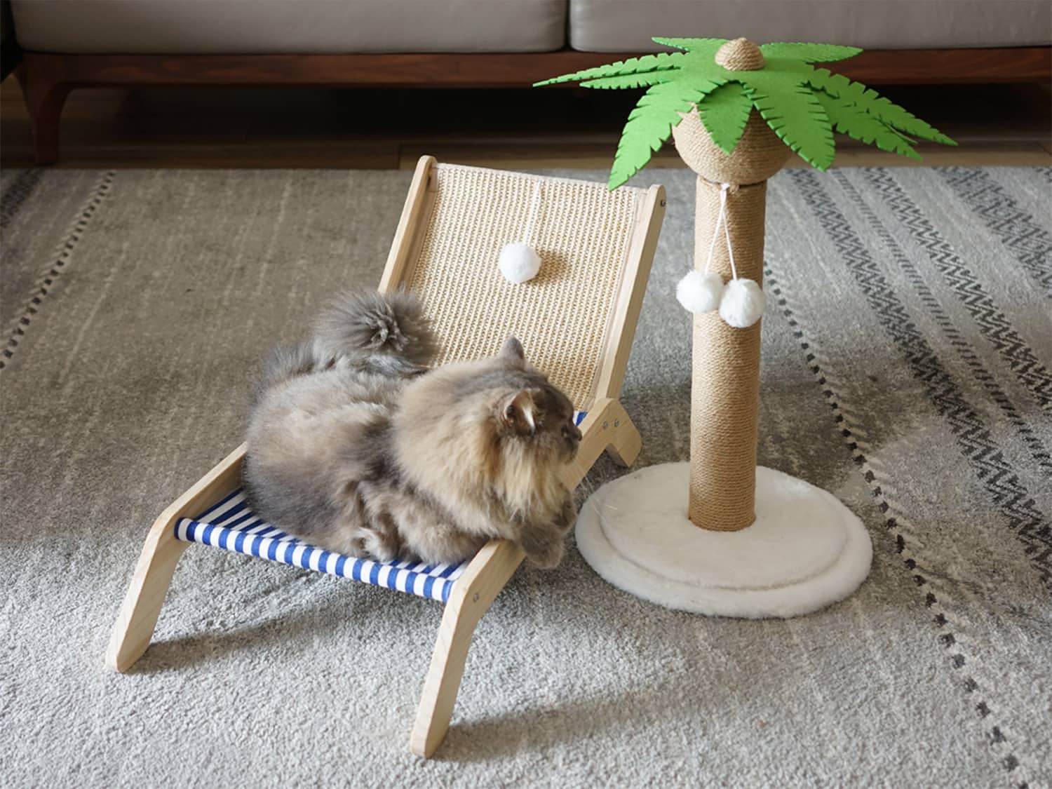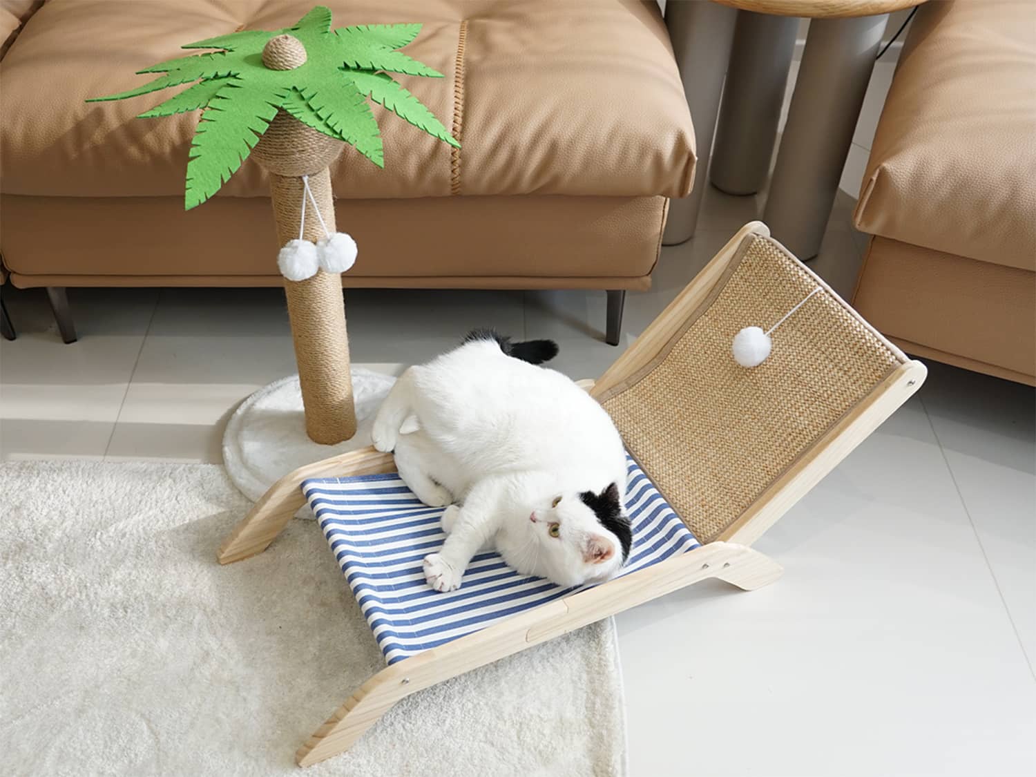 Send your lazy, pampered house cat on a tropical vacation to lie around all day even more with this cool new Cat Beach Chair. This miniature wooden beach chair for cats has a hammock-style bed, a natural sisal scratchpad for a seat back, and it comes with a nearly 2 ft tall palm tree scratching post that also provides a little shade for your sunbathing cat. It features solid pine wood construction, an elevated design, anti-slip legs, and comes with 3 hanging toy balls as well. Hmm, cat sunglasses sold separately. πΌπͺποΈ