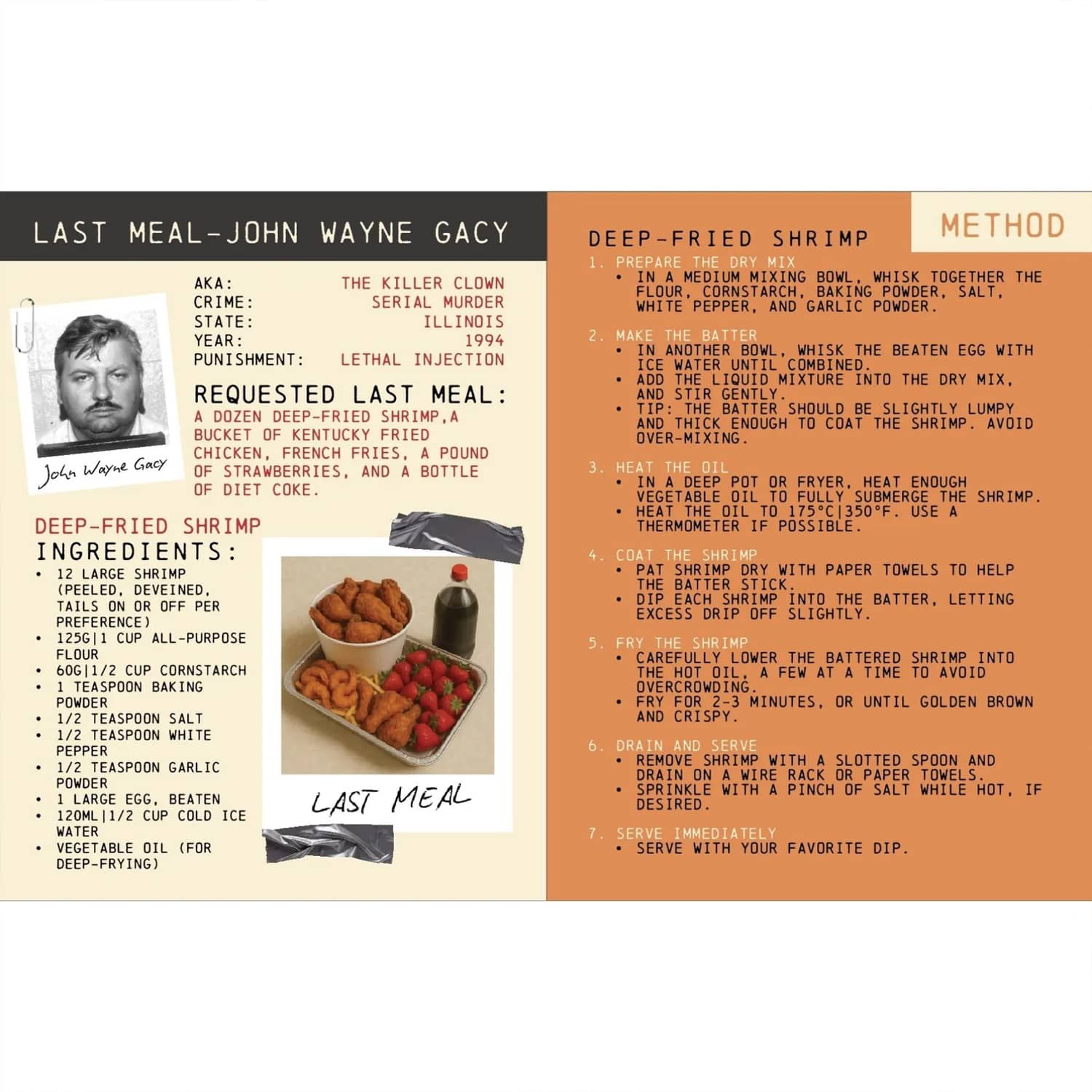 If you love true crime and need ideas for preparing great meals that are so tasty that criminally insane death row inmates chose them for their last one before being executed, then crack open this cool new Death Row Recipes Cookbook. Well, you might know what you would request for a last meal (hmm, I would request the Never-Ending Pasta Bowl at Olive Garden, the Endless Shrimp at Red Lobster, or an All-You-Can-Eat Buffet), but now you can explore the actual last meals of convicted criminals on death row, the recipes to make them, a deep dive into the crimes they committed, and their infamous last words. It's the perfect cookbook for true crime-loving foodies with a dark sense of humor and it makes an interesting gift for anyone with a taste of the macabre or who loves making dinners to die for as well. ๐ช๐ฎโโ๏ธโก๏ธ๐จ๐ผโ๐ณ๐