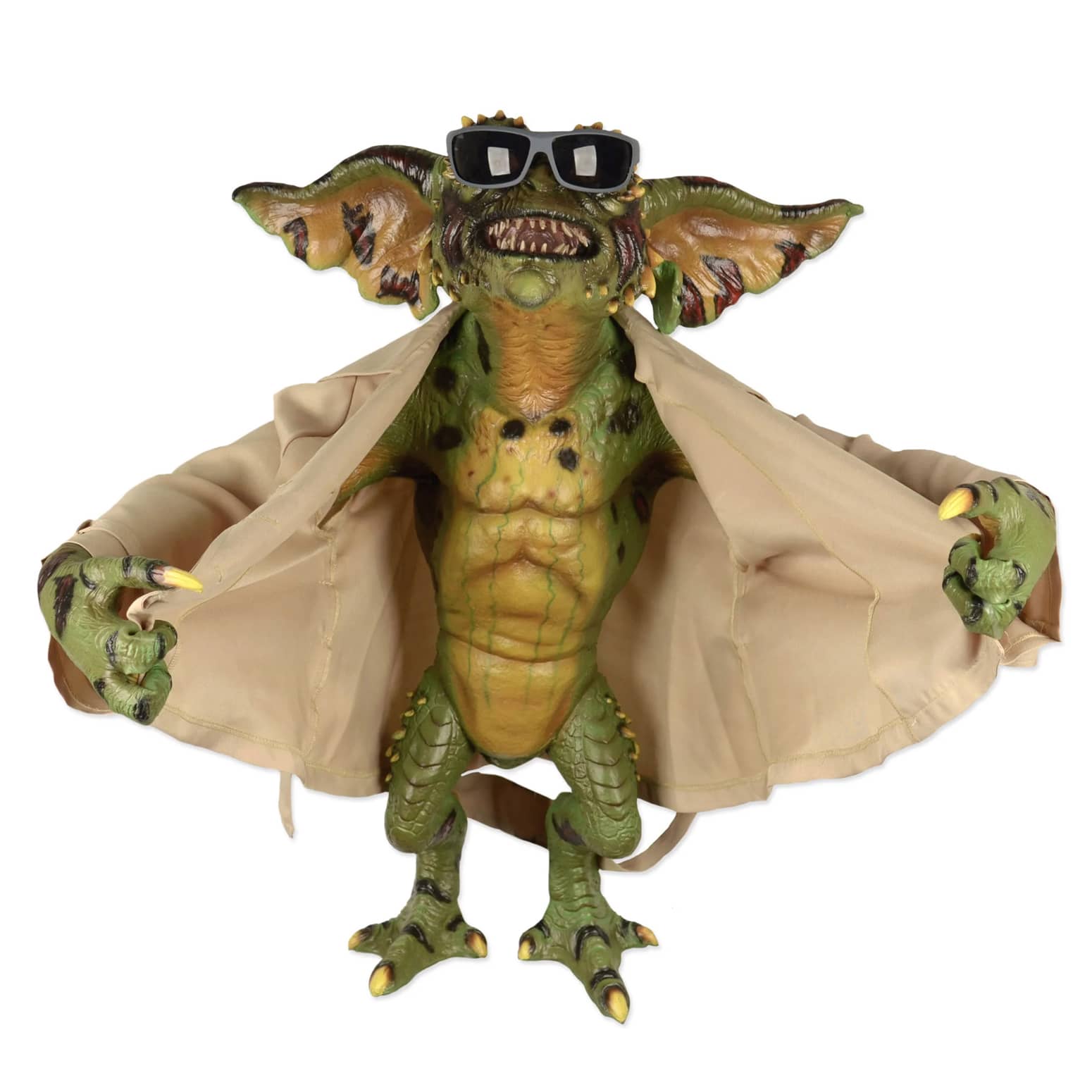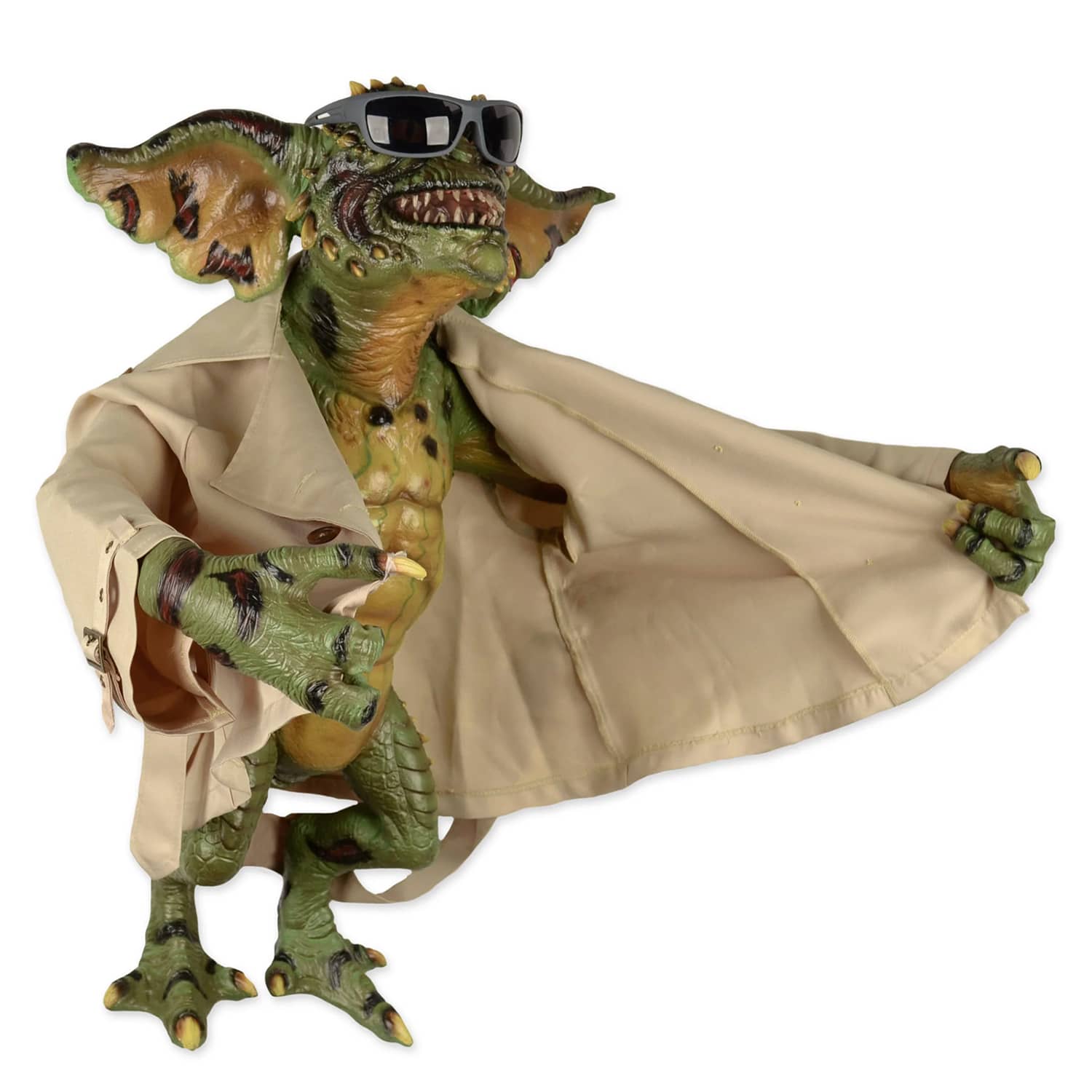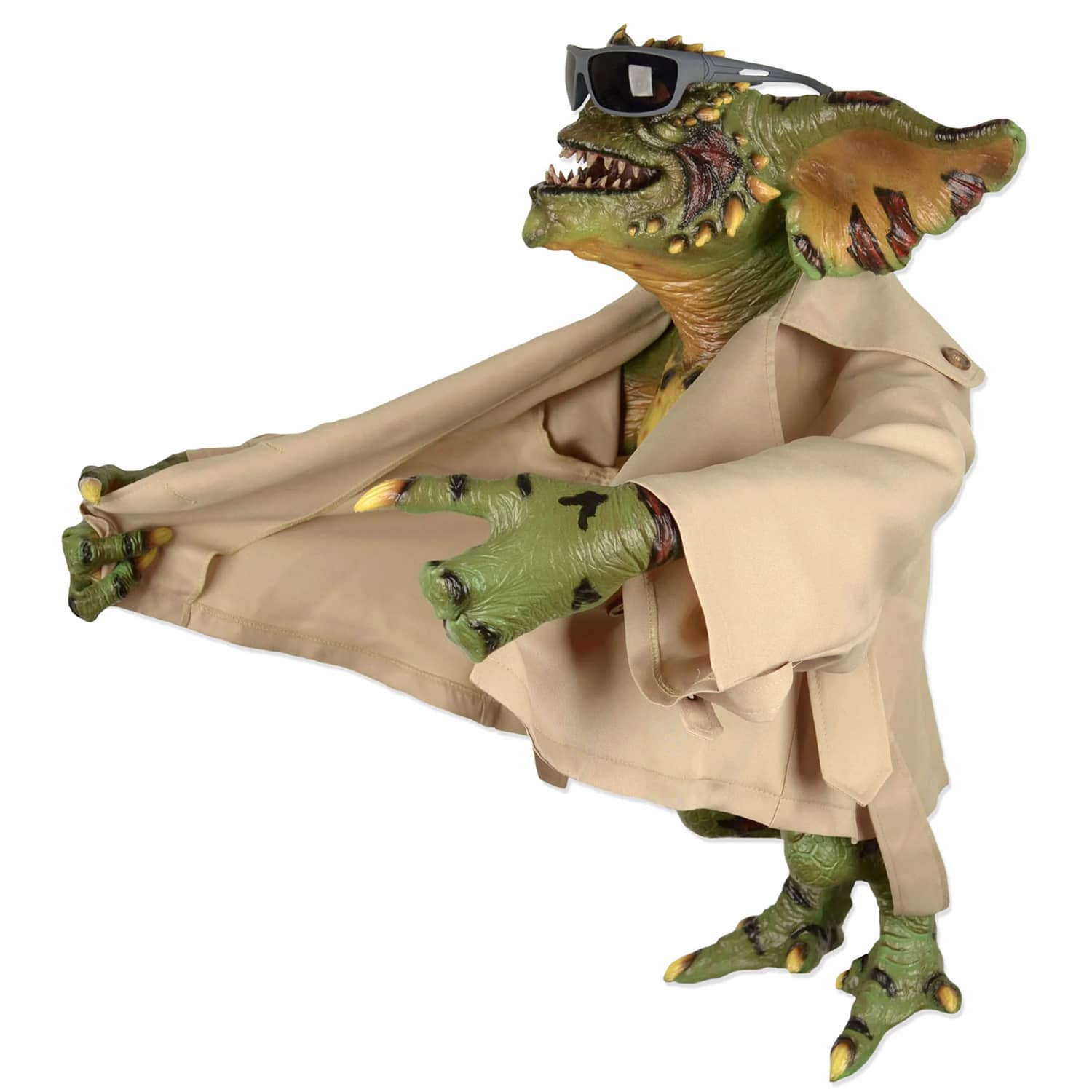 This holiday season, push the Christmas Story Leg Lamp out of the way in your home's front window and replace it with this cool new yet quite 1984-inspired Life-Sized Flasher Gremlin from NECA. This hilariously inappropriate yet still hilarious full-sized stunt puppet replica of the sleazy trenchcoat and sunglasses wearing Gremlin flashing everyone in the bar on Christmas Eve can now be yours. This mischievous, over-exposed Gremlin stands 30-inches tall, has a real fabric trenchcoat and removable sunglasses, and includes a metal display stand. Check out the video below to enjoy the glorious bar scene from Gremlins and the flasher Gremlin in action. Equally cool Bandit Gremlin statue sold separately. π§₯πΆοΈππ