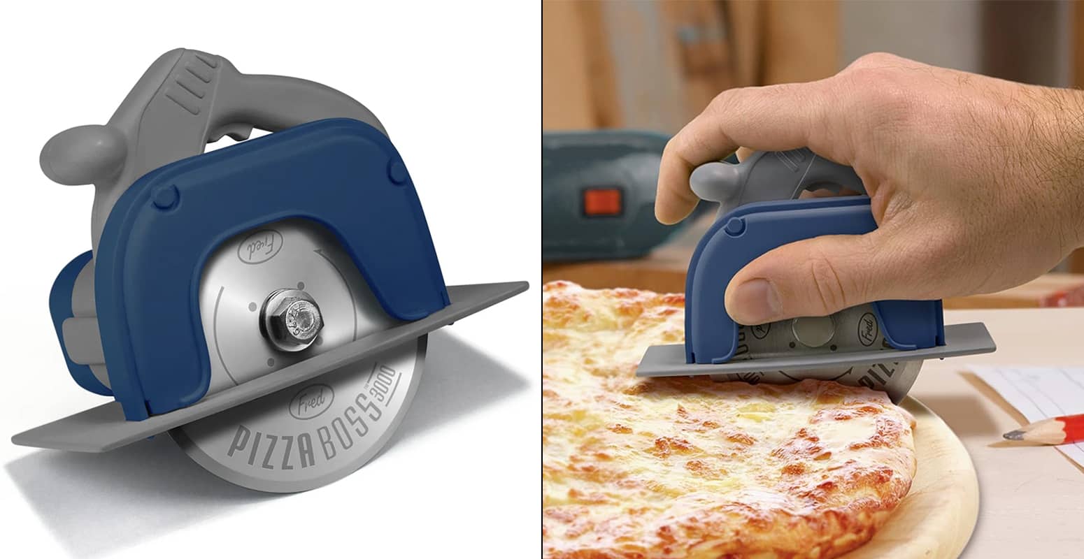 While slicing up a pizza with a full-sized buzzsaw might be taking it a tad too far and a regular silly pizza wheel is just lame and boring, this cool new Pizza Boss 3000 from FRED is just right. While it may look like a mini circular saw power tool ready to rip through wood, it's actually a pizza cutter with a laser-etched stainless steel pizza wheel blade instead of a toothed saw blade that's ready to rip through crispy crust, bubbling hot cheese, and toppings instead. It's perfect for pizza-loving power tool enthusiasts, woodworkers, contractors, remodelers, DIYers, and more. ππͺ