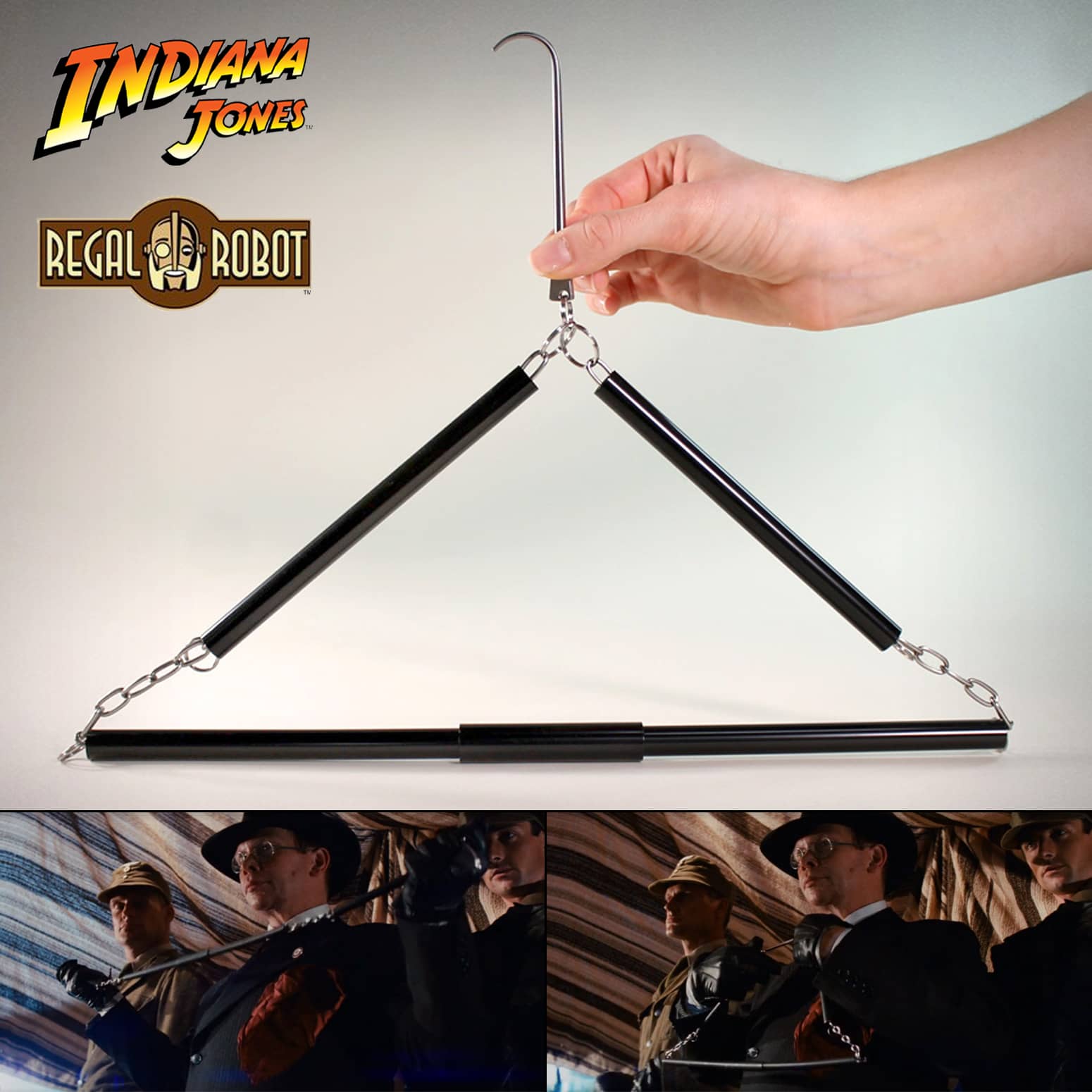 This fully functional, 1:1 scale replica of the elaborate travel hanger that Gestapo agent Toht used to threaten Marion Ravenwood and Belloq and then casually assembled into a harmless coat hanger can now be yours. Limited to only 500 pieces, each transforming portable hanger replica features all-metal construction with a powder-coated black finish, a custom-machined stainless steel hook, a custom metal chain, a Certificate of Authenticity, and arrives in a gift-able 18-inch black presentation box.