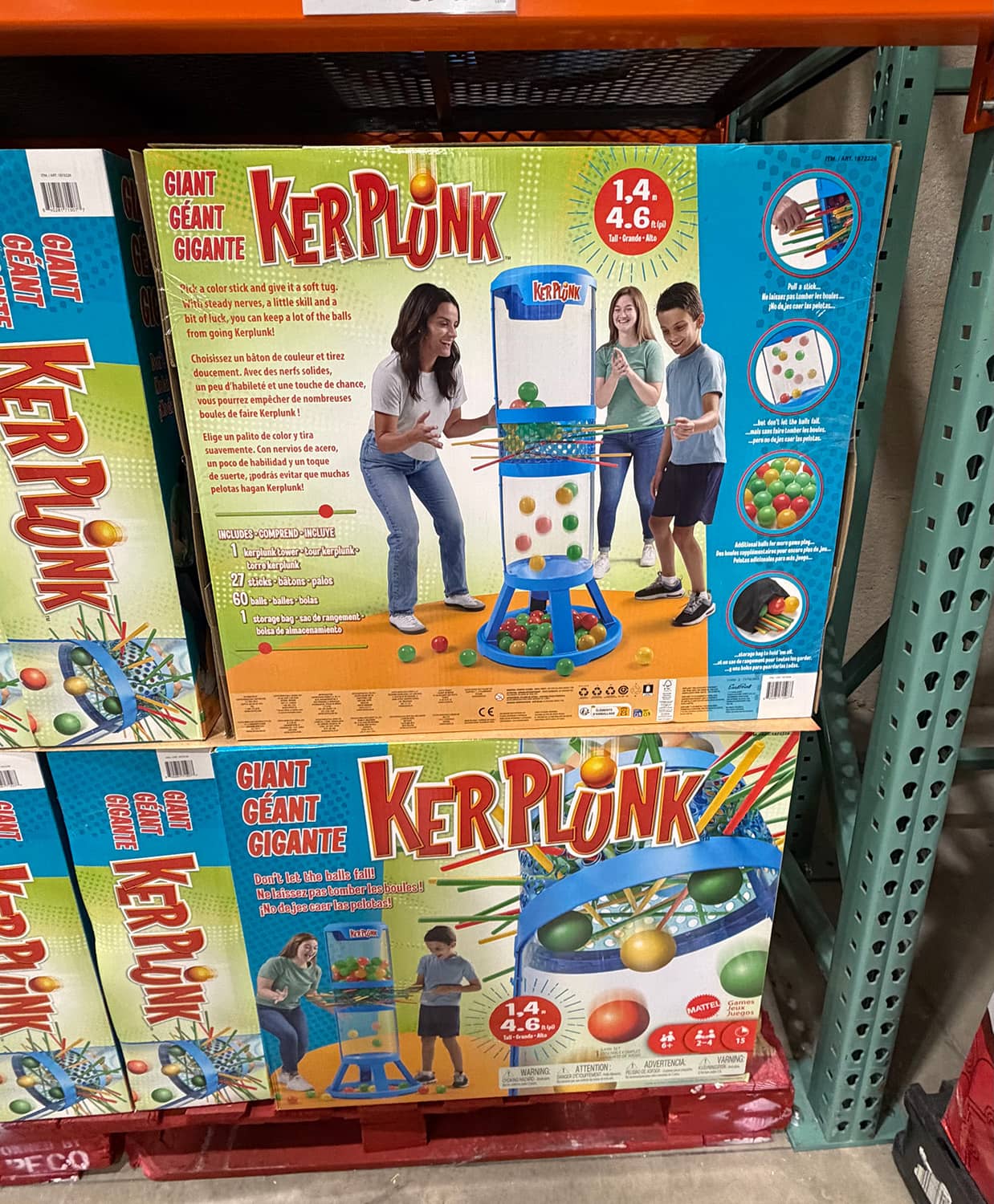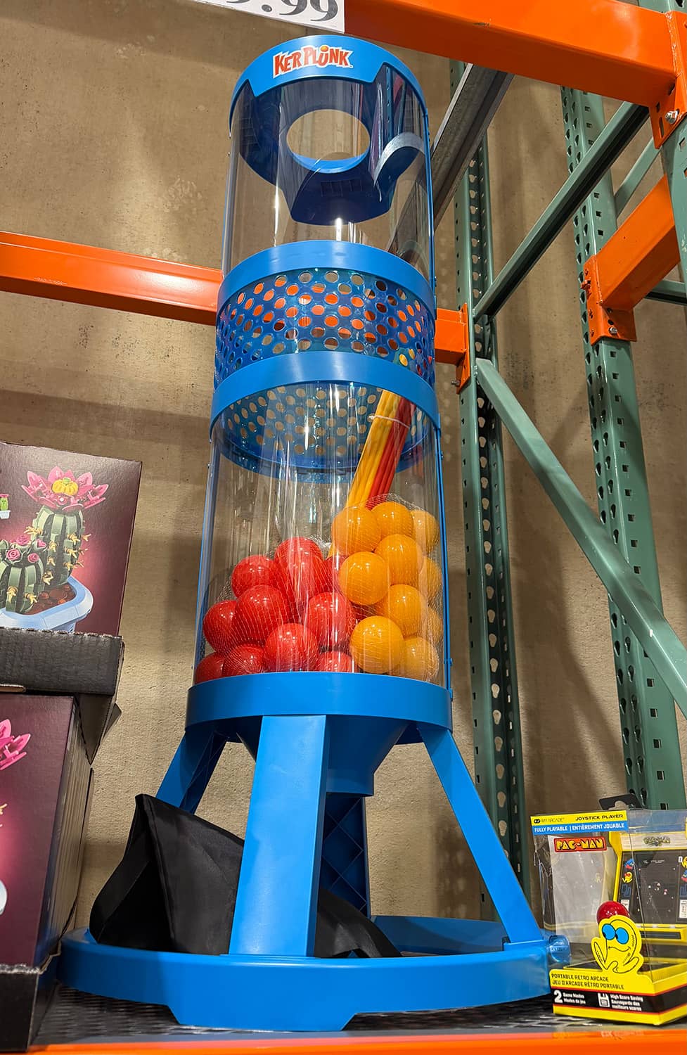 This cool new yet quite retro-inspired Giant KerPlunk Game from Mattel and EastPoint Sports scales up the classic sticks, marbles, nerves of steel, and physical skills game of KerPlunk immensely from tabletop to floor or backyard. This gigantic, oversized version of KerPlunk stands 4.6-ft tall and challenges players to stand up and take turns pulling one stick at a time from an intertwined lattice of colorful sticks that hold up 60 balls in a transparent tube tower without causing all of them to tumble down. It's sort of like the suspenseful wooden toppling tower game, but with balls and sticks instead. It can be played indoors or out, includes a handy storage bag, and is perfect for game nights, backyard parties, block parties, indoor parties, birthday parties, holiday parties, parties of all other sorts, the office break room, or actual giants who thought the original game was way too small to play.