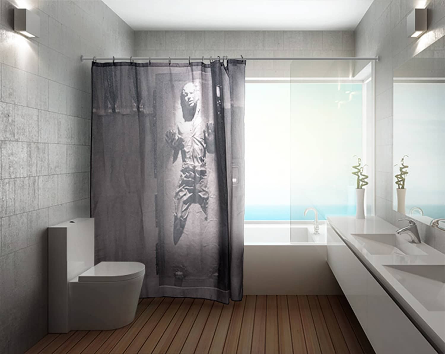 Hang up the most famous frozen smuggler in the galaxy from your shower rod just like Jabba the Hutt did on the wall of his swinging throne room on Tatooine with this cool new yet from a long time ago-inspired Han Solo Frozen In Carbonite Shower Curtain. Sure, it might be a little strange to have Han Solo frozen in Carbonite in the shower with you, but don't worry, Han has hibernation sickness and can't see a thing. This officially licensed Star Wars: The Shower Curtain is made from 100% polyester instead of the usual Cloud City carbon-freezing technique, measures 71-inches square, and includes 12 handy shower curtain hooks since it doesn't have repulsorlift projectors to float on its own. Hmm, if you see a shadow approaching while in the shower, don't worry, it's not a bounty hunter holding a thermal detonator, it's.... Princess Leia in disguise! Maybe not.{YOUTUB2E}bkPGin1lIgY{/YOUTUBE2}