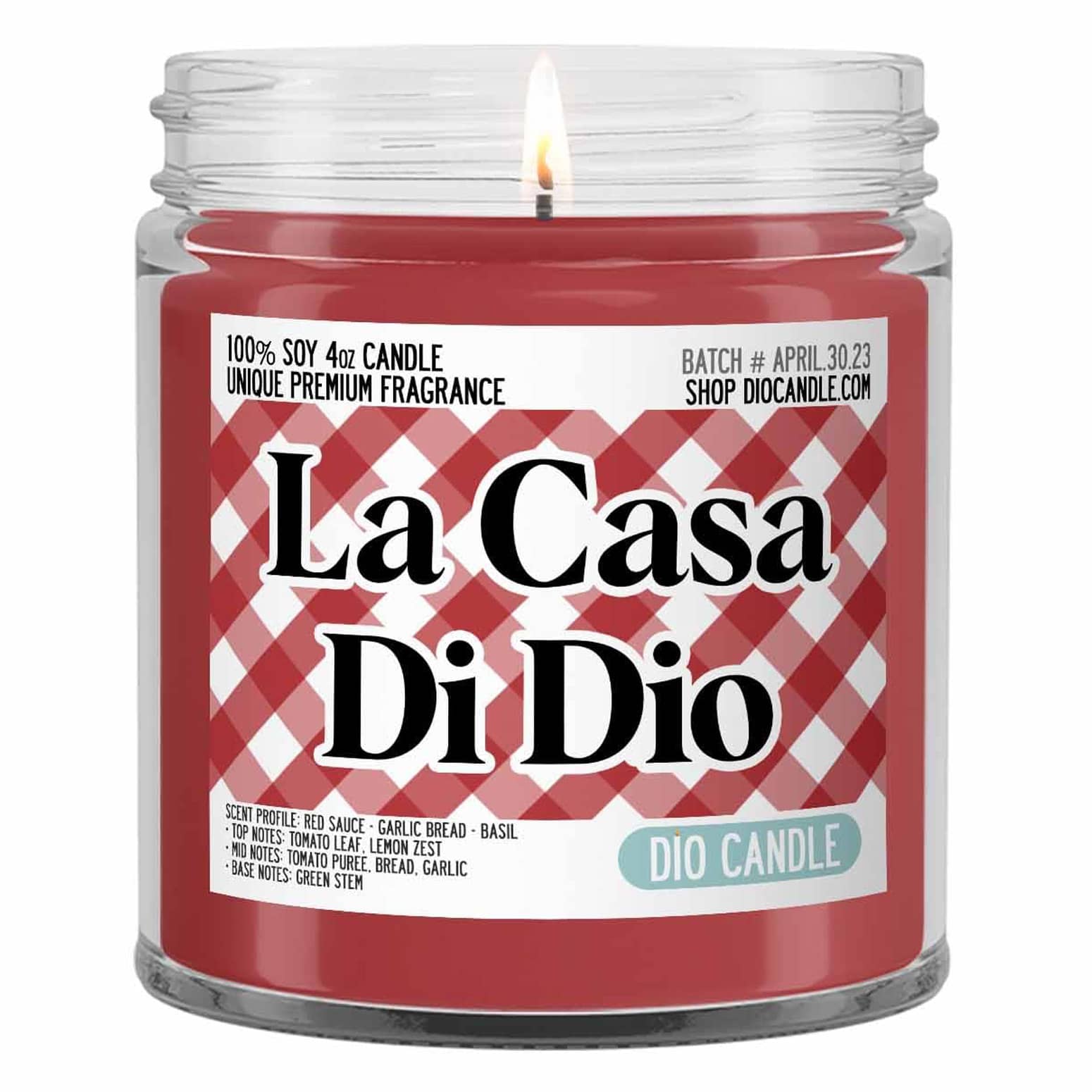 Wish you were in Italy? Miss your nonna's red sauce simmering on the stovetop? Want a candle that could ruin your diet? Then light up this cool new yet quite nostalgic La Casa di Dio Candle from DIO Candle Company in Denver, CO. This hunger-inducing, Italian-inspired soy wax candle is scented like a pot of tomato basil red sauce with a side of garlic bread. Combining the mouth-watering scents of ripe pureed tomatoes, tomato leaves, oregano, basil, and a hint of garlic bread, this fun scented candle is sure to confuse anyone lured by their nose into the kitchen hoping for some homemade Italian cooking. Please don't eat or drizzle the red melted wax on your pasta. ππΏπ π§π₯π―οΈ