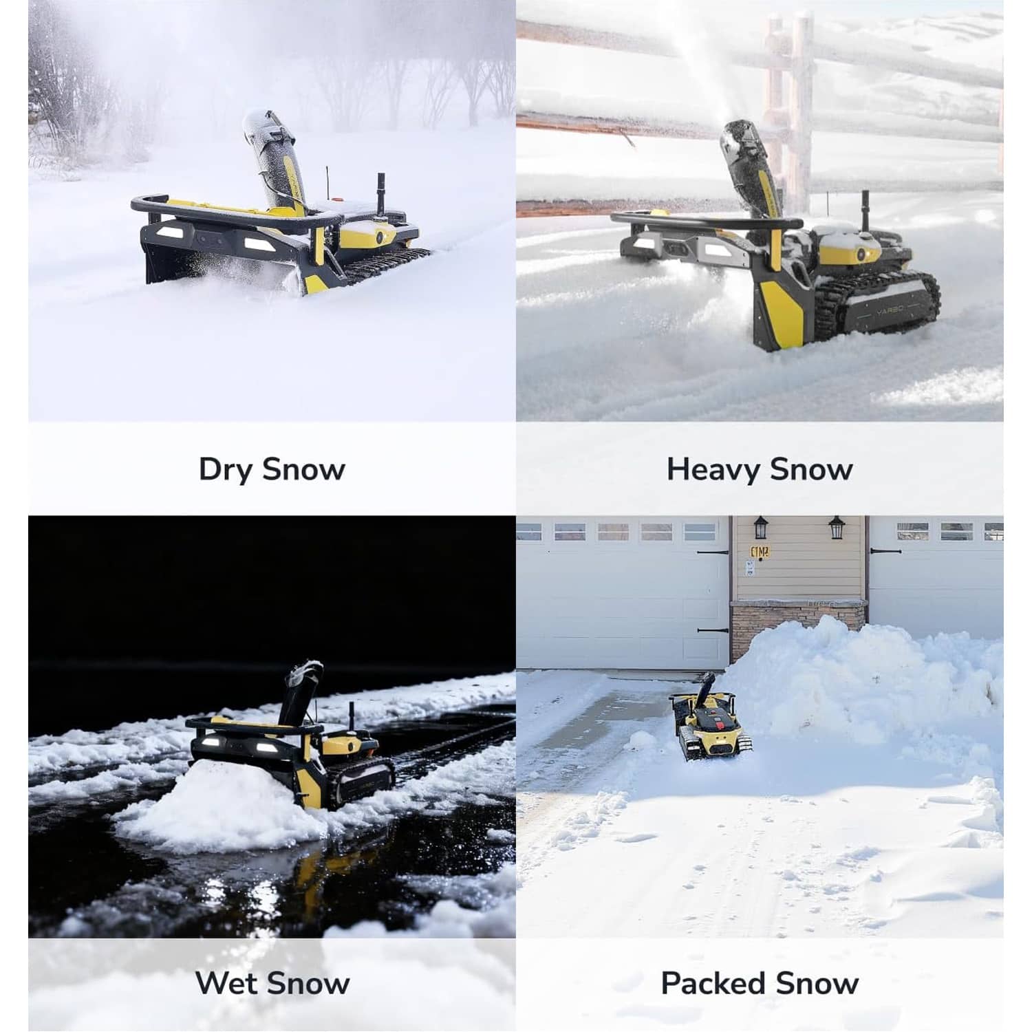 Why are you still breaking your back shoveling fresh fallen snow or battling a freezing blizzard with a huge, noisy snow blower when there are now autonomous smart robots to that for you? This cool new YARBO Snow Blower Robot is a heavy-duty modular track-driven robot with a 2-stage snow blower attachment (lawn mower, leaf blower, and trimmer attachments also available) that clears away up to 12-inches of snow on your driveway, walkway, sidewalk, patio, or parking lot automatically with ease, 24/7.