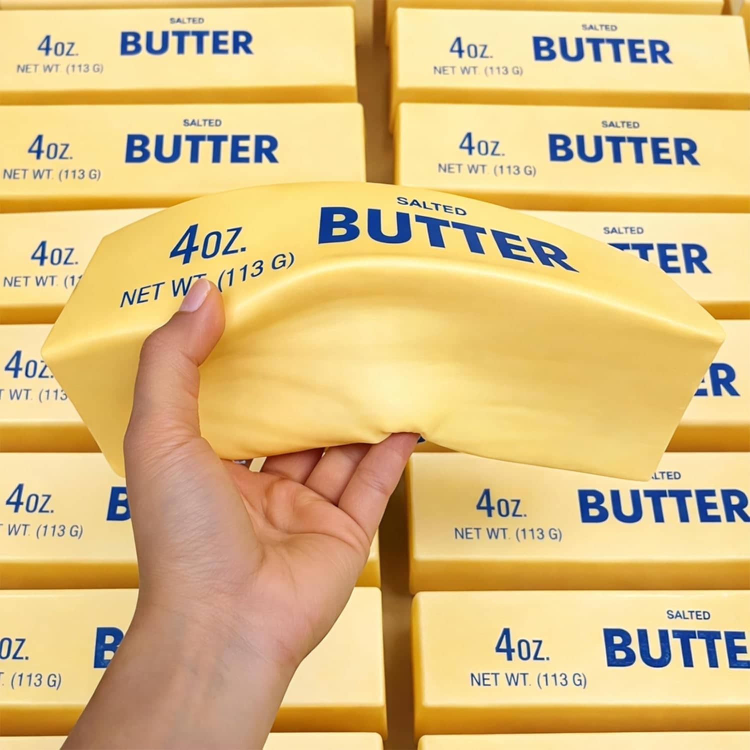 While it might be satisfying, don't grab a real stick of butter from the fridge to squeeze when you get stressed out. Not only will it make an extruded slippery mess of butter (after you have to wait for it to soften a bit), you also lose an entire stick of butter in the process. The better squeezable butter alternative is this cool new Giant Squishy Butter Stick.
