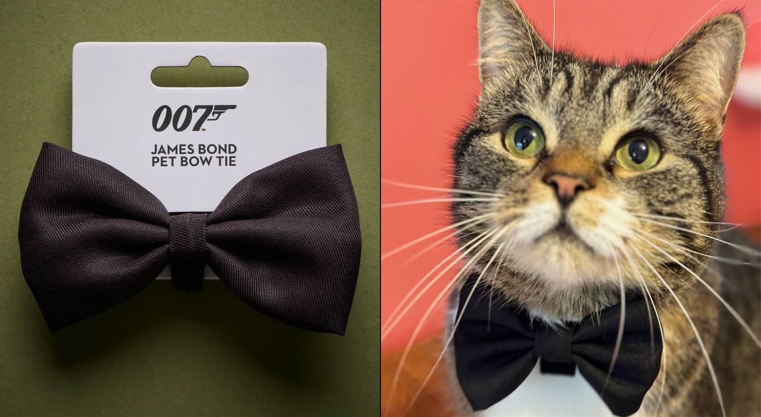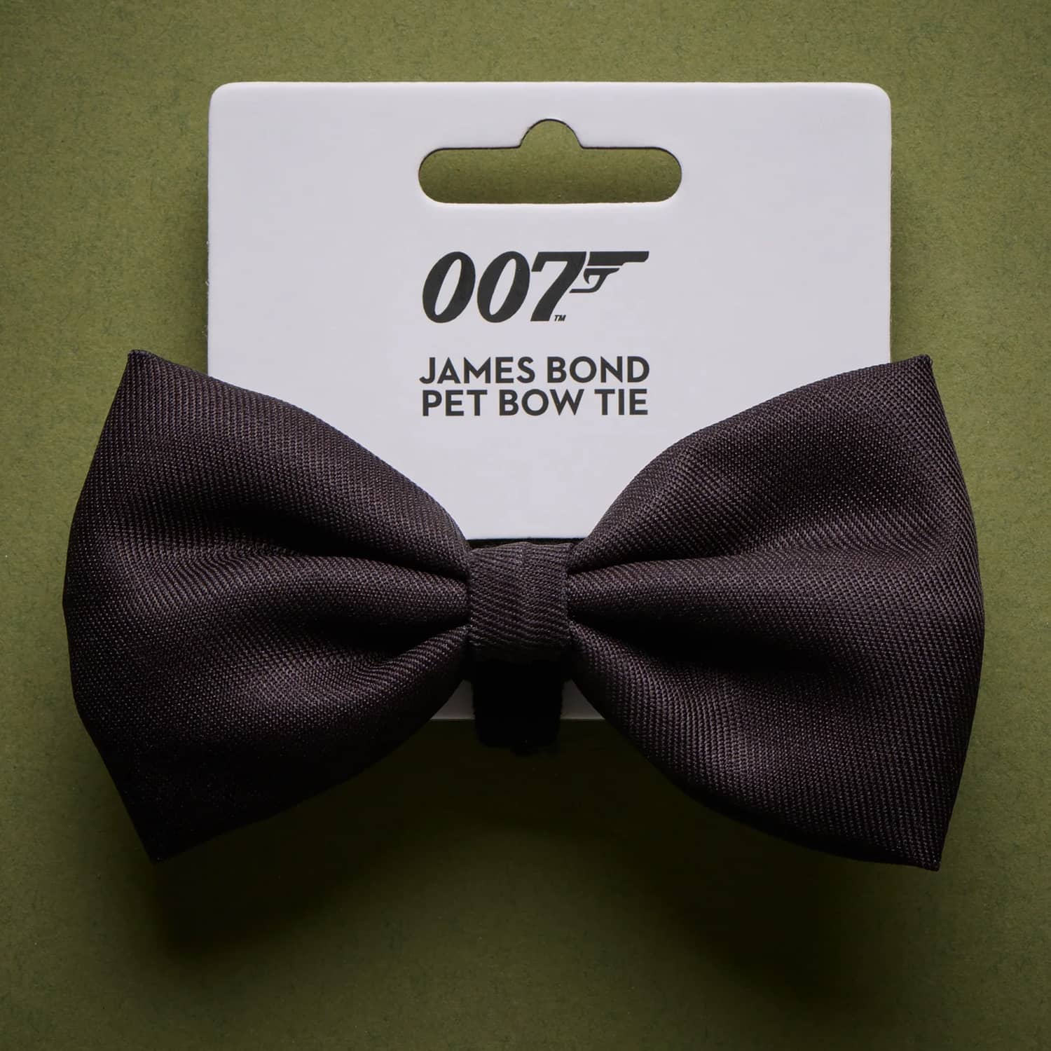 Transform your lazy, pampered pets into dashing British secret agents when you attach this cool new yet quite retro-inspired James Bond 007 Pet Bow Tie to their collar. This stylish, scaled-down replica of James Bond's signature silk bow tie is made from a more pet-friendly black woven fabric with a twill texture that is washable and quick-drying instead. It's perfect for dogs or cats on a top-secret mission to suavely blend in at a formal supervillain soiree (hopefully Blofeld's cat won't notice them), Halloween and costume parties, weddings, photoshoots that will surely get you pounced upon afterward, or just anytime they sit with you while watching old James Bond movies. License to Kill, not included. πŸ˜Όβ§“πŸΈ